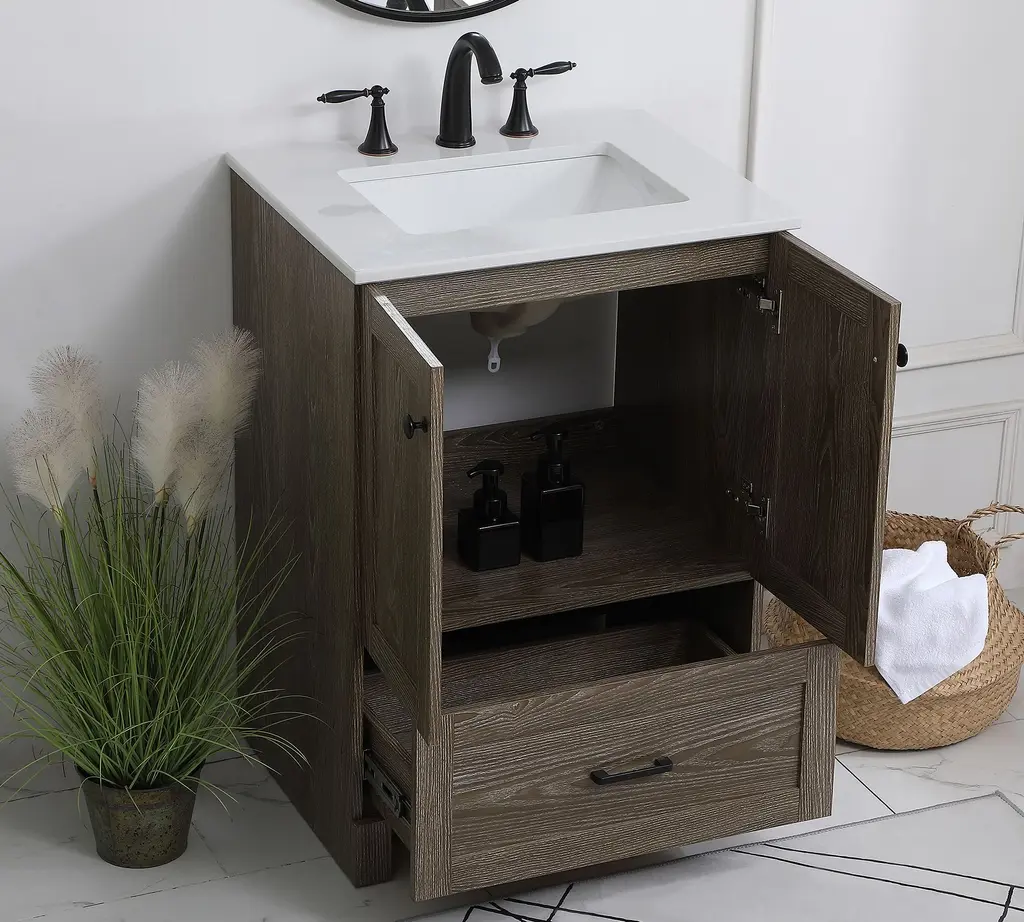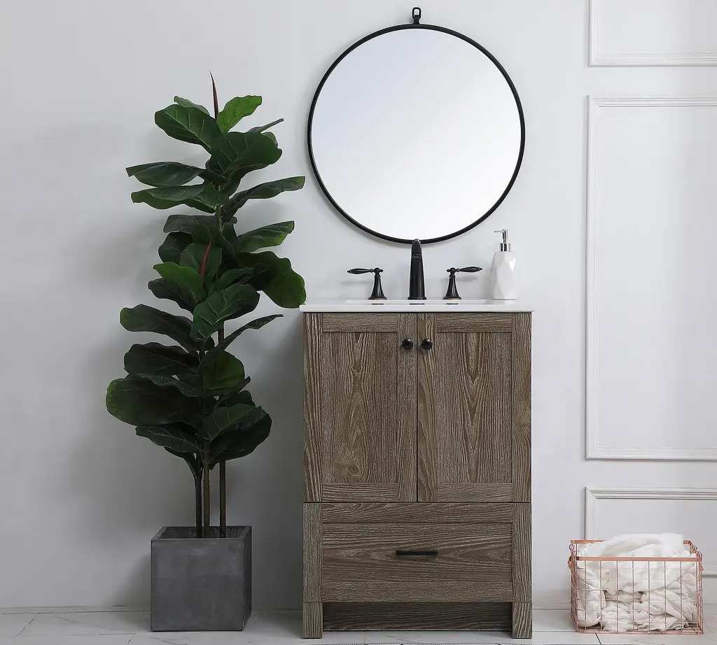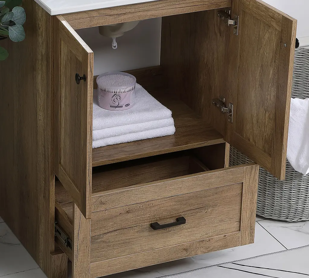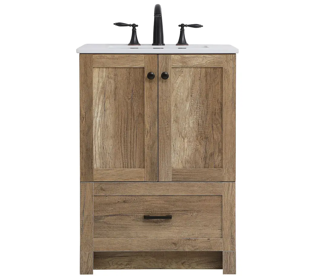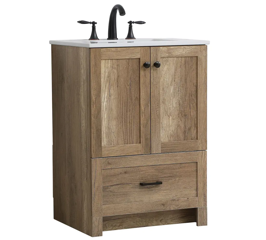 Clean lines and the warm look of wood lend a farmhouse feel to this vanity. Accented with pops of black for a modern edge, Alderson features storage to keep all your essentials organized (and the bath clutter free).