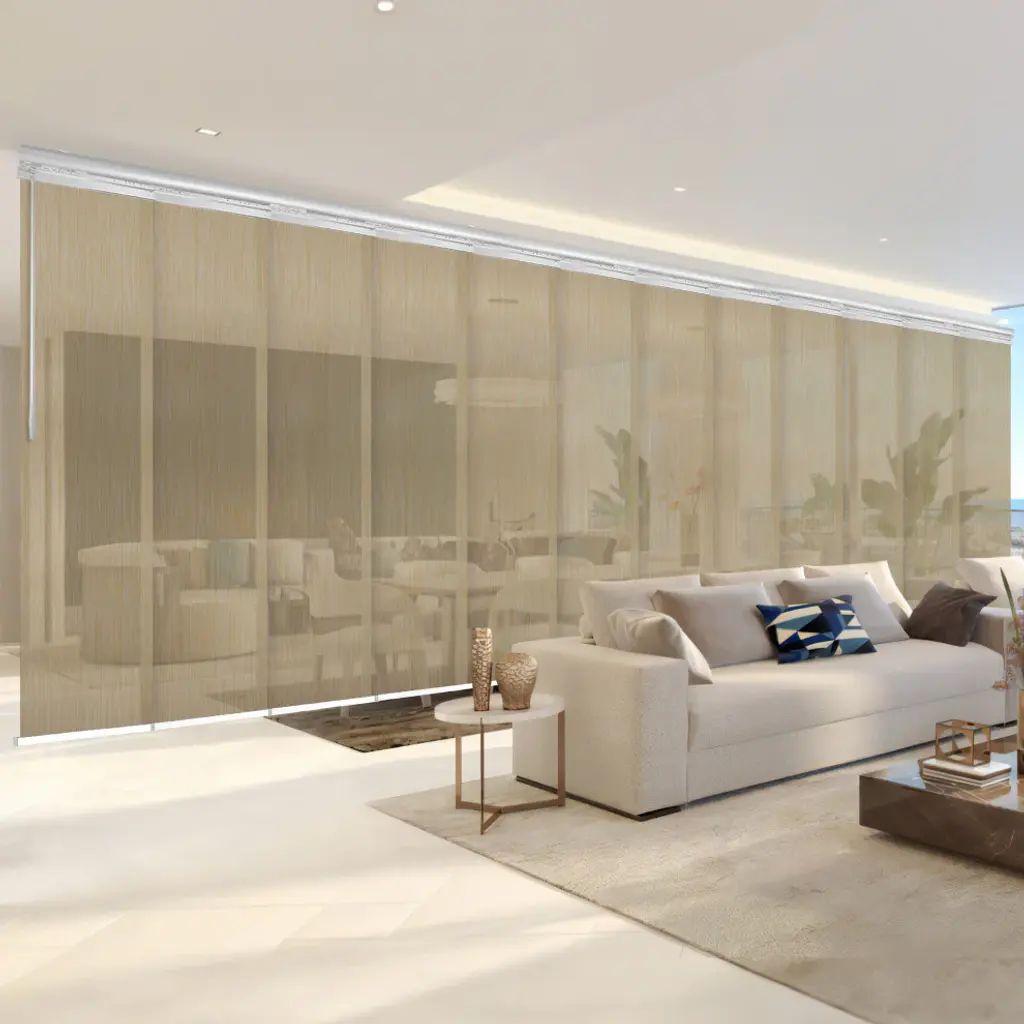 Central Design Products is pleased to introduce a new innovative panel track that offers easy 2-way installation, adding an alluring style and refined touch to your home decor. The double rail design of the track is sleek, compact, and reduces the overall footprint and weight of the installation, eliminating bulky, intrusive window treatments. Adjusting the panel height is a breeze � simply trim the panel, re-attach the liner, and install the panel weight. Detailed instructions are included.The panel track also features a patented slider design, made with aluminum and fitted with bearings that allow for durable and smooth operation. The sliders are stacked closer together than conventional panel tracks, reducing light bleed coming from the gaps between panels. This track has endless uses from dividing rooms, garages, offices, and closets to decorating windows and patios. Available in smaller sizes including 3, 4, 5, 6, and 7 panels. Extends from 140-260� wide. Each panel measures 23.5" wide and 116" tall, with a total installation height of 118.5" (includes the 2.5" rail track). The track can be wall or ceiling mounted. The panels can stack on the left or the right. The clearance from the wall is extendable from 1.25� to 3.25� and projection from the wall is extendable from 3� to 4.25�. Aldi panel is made from 80% Vinyl 20% Polyester, with a light filtering shade that blocks 40% of the light.