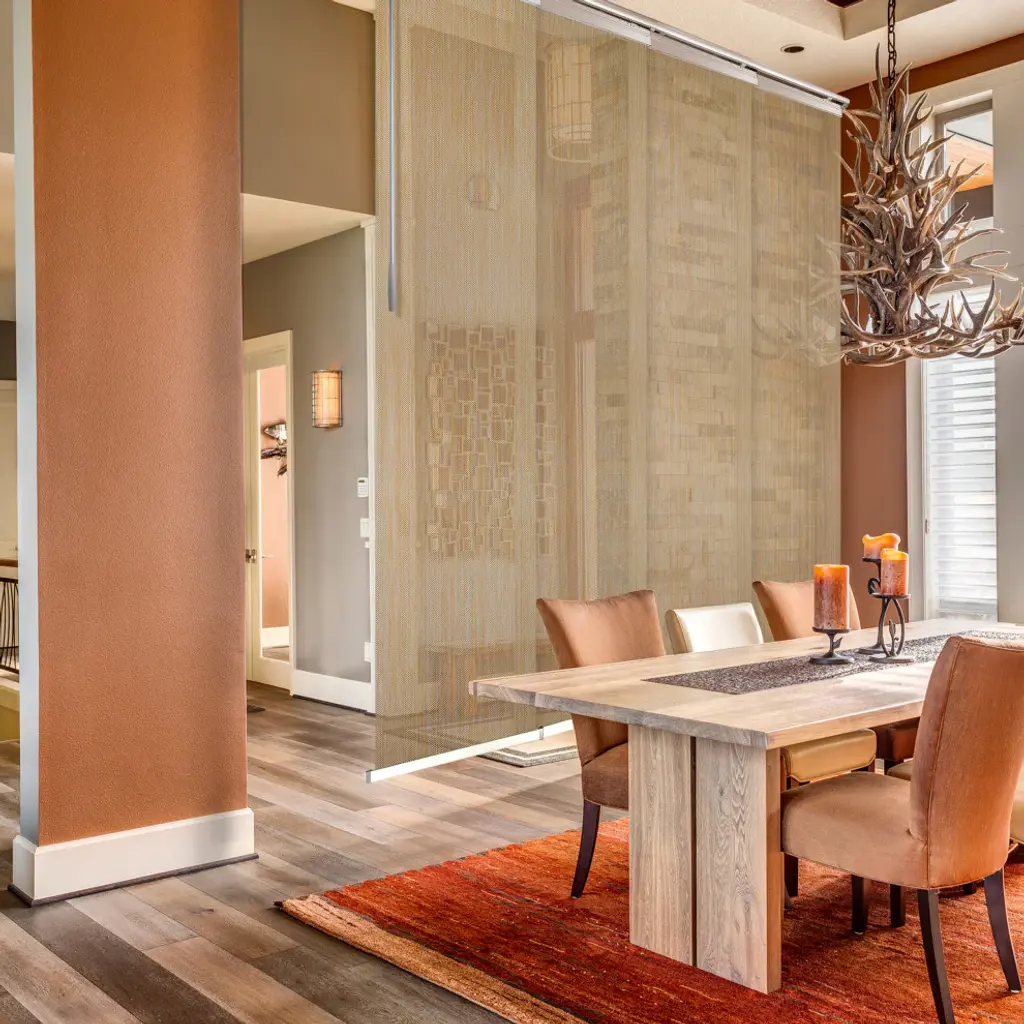 Central Design Products is pleased to introduce a new innovative panel track that offers easy 2-way installation, adding an alluring style and refined touch to your home decor. The single rail design of the track is sleek, compact, and reduces the overall footprint and weight of the installation, eliminating bulky, intrusive window treatments. Adjusting the panel height is a breeze � simply trim the panel, re-attach the liner, and install the panel weight. Detailed instructions are included.The panel track also features a patented slider design, made with aluminum and fitted with bearings that allow for durable and smooth operation. The sliders are stacked closer together than conventional panel tracks, reducing light bleed coming from the gaps between panels. This track has endless uses from dividing rooms, garages, offices, and closets to decorating windows and patios. Available in larger sizes including 8, 10, and 12 panels. Extends from 48-88� wide. Each panel measures 23.5" wide and 116" tall, with a total installation height of 118.5" (includes the 2.5" rail track). The track can be wall or ceiling mounted. The panels can stack on the left or the right. The clearance from the wall is extendable from 1.25� to 3.25� and projection from the wall is extendable from 3� to 4.25�. Aldi panel is made from 80% Vinyl 20% Polyester, with a light filtering shade that blocks 40% of the light.