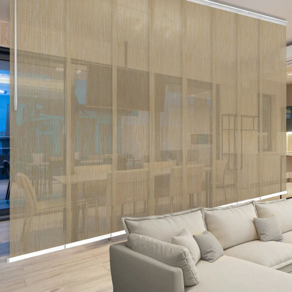 Central Design Products is pleased to introduce a new innovative panel track that offers easy 2-way installation, adding an alluring style and refined touch to your home decor. The double rail design of the track is sleek, compact, and reduces the overall footprint and weight of the installation, eliminating bulky, intrusive window treatments. Adjusting the panel height is a breeze � simply trim the panel, re-attach the liner, and install the panel weight. Detailed instructions are included.The panel track also features a patented slider design, made with aluminum and fitted with bearings that allow for durable and smooth operation. The sliders are stacked closer together than conventional panel tracks, reducing light bleed coming from the gaps between panels. This track has endless uses from dividing rooms, garages, offices, and closets to decorating windows and patios. Available in smaller sizes including 3, 4, 5, 6, and 7 panels. Extends from 130-175� wide. Each panel measures 23.5" wide and 116" tall, with a total installation height of 118.5" (includes the 2.5" rail track). The track can be wall or ceiling mounted. The panels can stack on the left or the right. The clearance from the wall is extendable from 1.25� to 3.25� and projection from the wall is extendable from 3� to 4.25�. Aldi panel is made from 80% Vinyl 20% Polyester, with a light filtering shade that blocks 40% of the light.