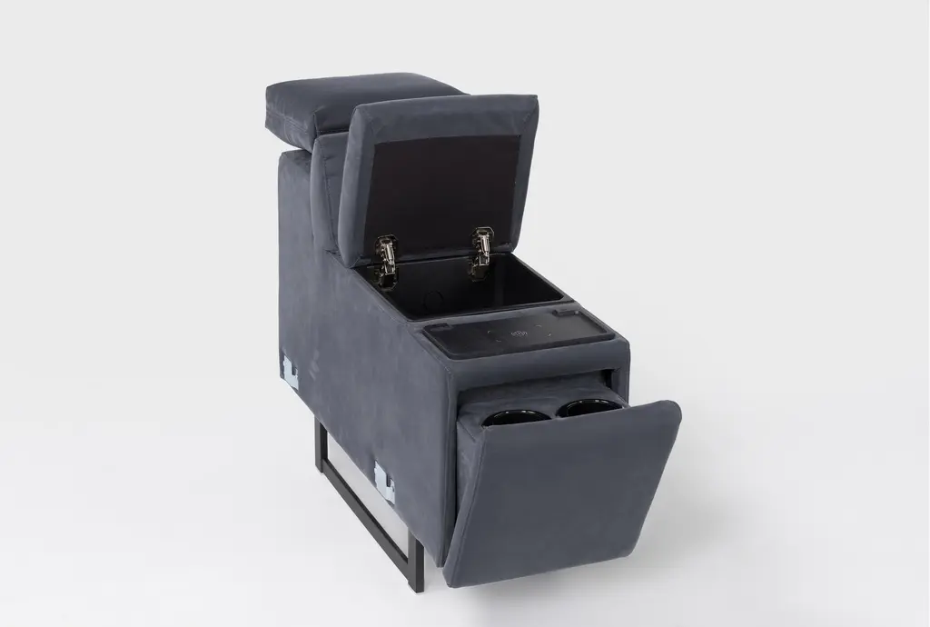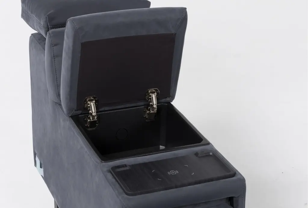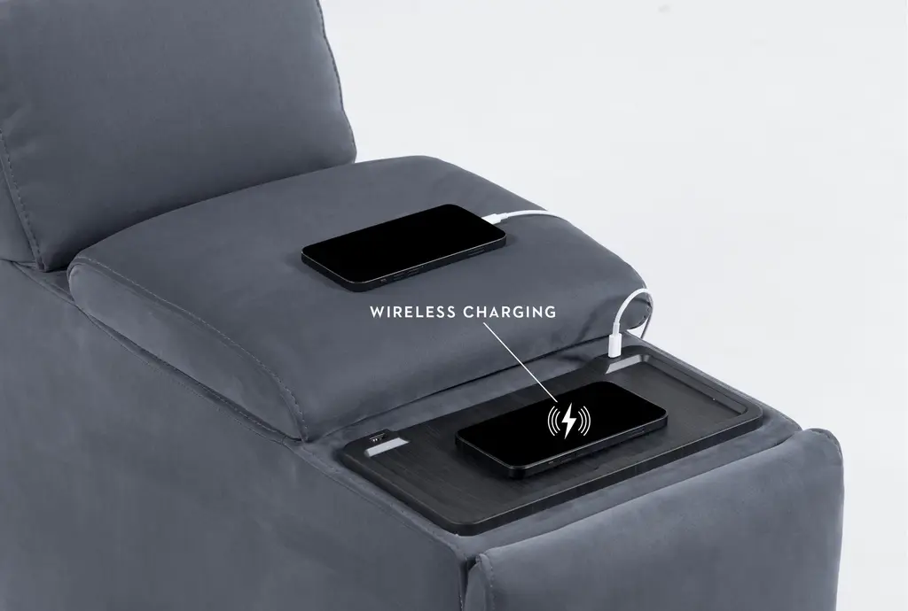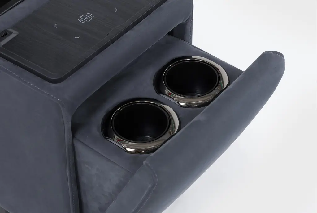 Self-care can be a part of your everyday life with our indulgent Alessa console. The modern-chic design boasts high-performance suede-like fabric that is soft and easy to care for. Storage, cupholders, wireless and USB charging enhance your entire experience.