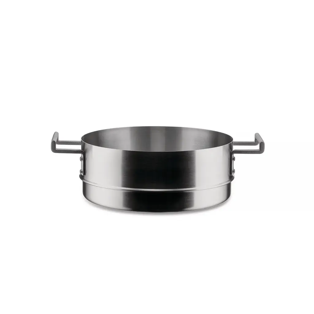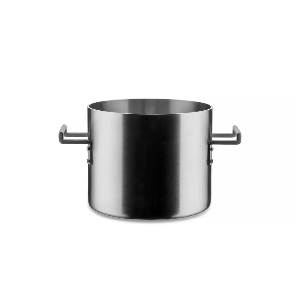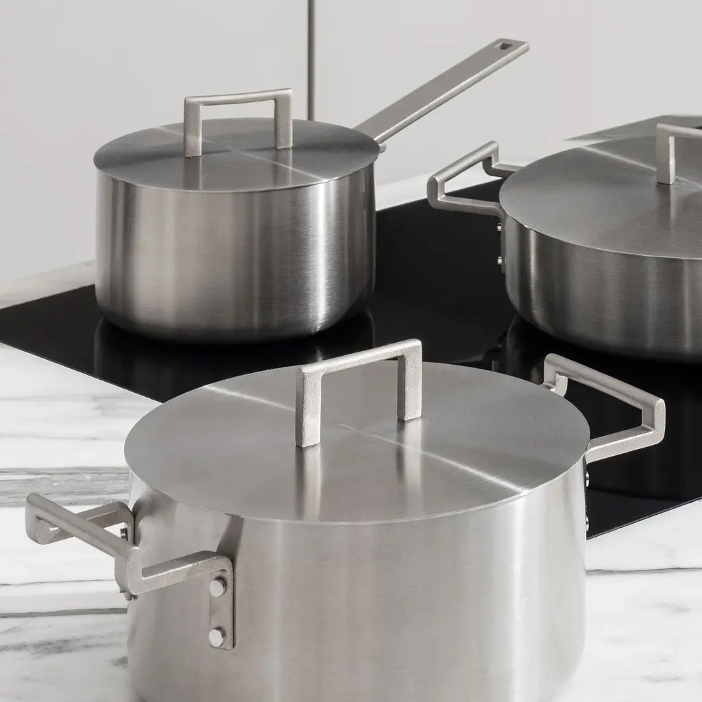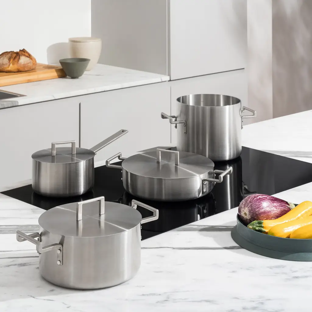 Immerse yourself into the joy of cooking with this complete cookware set from Alessi. Inspired by the conviviality of preparing and sharing food with family and friends, the Convivio Cookware Set blends a minimalist style with long-lasting materials. The collection was created by two visionary minds, Pritzker Prize winner David Chipperfield and Michelin-starred chef Pietro Leemann, offering the perfect balance between aesthetics and function. The Alessi Convivio Cookware Set consists of a pot, a casserole with two handles, a low casserole with two handles, and a saucepan, with three lids also included. Made from 18/10 stainless steel – with the saucepan made from a blend of aluminum and stainless steel – the cookware is durable, versatile and features a brushed finish. Angular handles add a striking accent to the designs, ensuring that these pots and pans will always add a stylish touch to your kitchen.