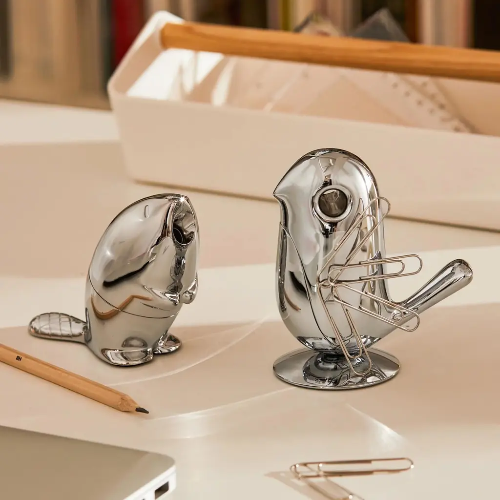Drawing inspiration from the diligent beaver, the Alessi Kastor Pencil Sharpener, designed by Rodrigo Torres, is a testament to nature’s ingenuity merged with modern functionality. Crafted with meticulous precision, this sculptural piece, fashioned from chrome-plated zamak, epitomizes exceptional metalwork. Its polished form, reflecting subtle ambient glints, not only serves as a functional office essential but also as an artistic statement piece. Positioned on your desk, it invites users to insert a pencil into the beaver’s mouth, mimicking the act of gnawing a log, and resulting in a perfectly honed tip. Ready to find its place as a highlight among Gessato Design Store’s curated selections, the Alessi Kastor Pencil Sharpener transcends the mundane, offering a playful twist to everyday tasks.