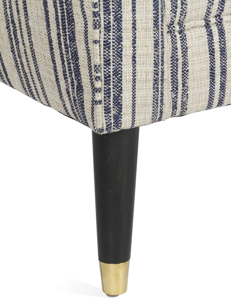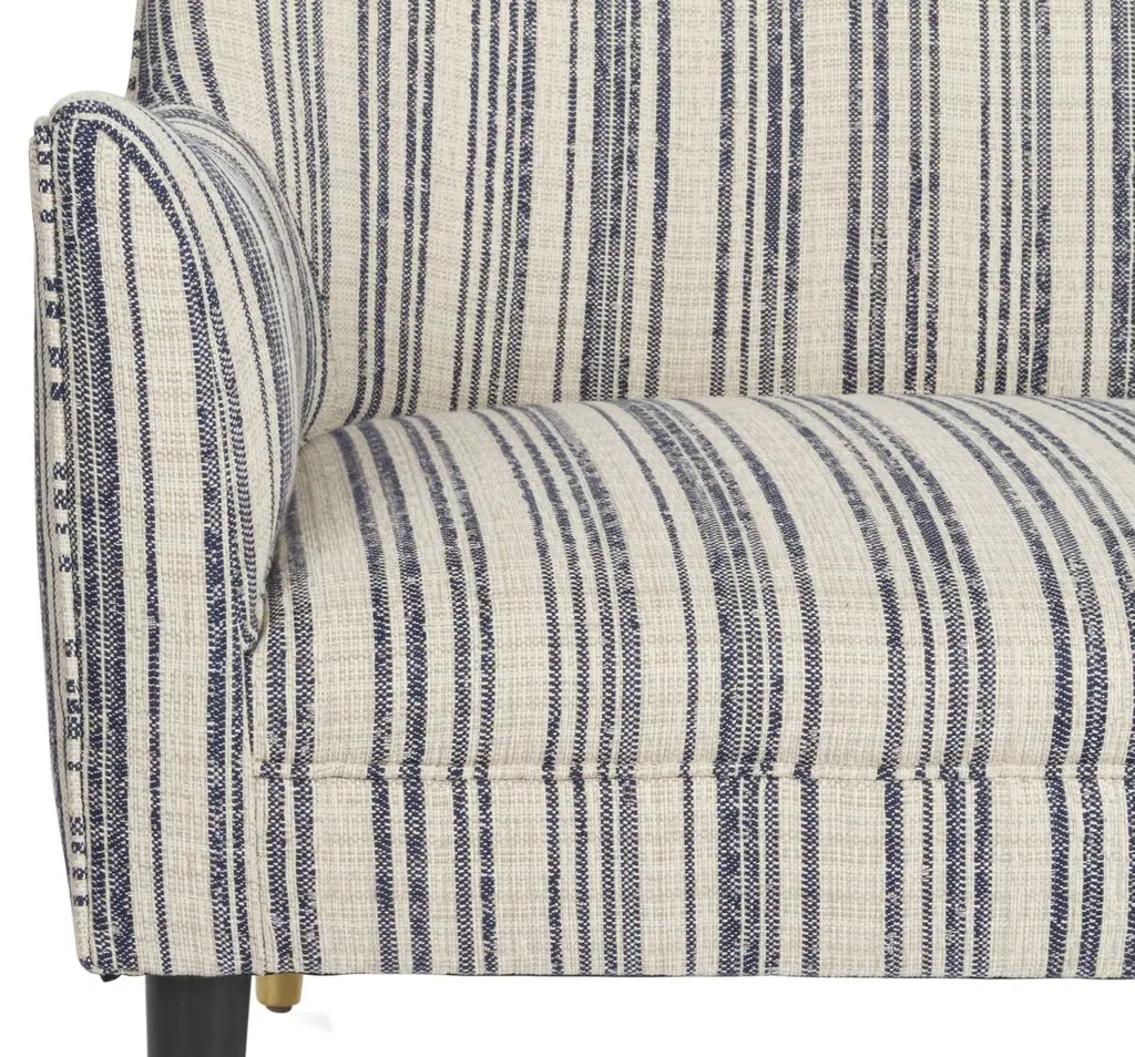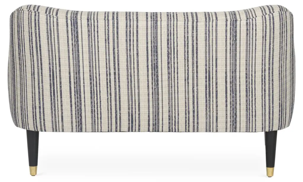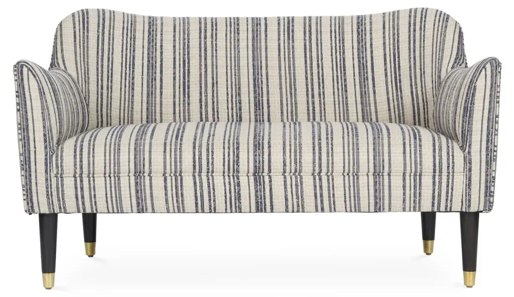 Available online exclusively at One Kings Lane: This settee is crafted of alder with a curvy silhouette, tight seat and back, and tapered legs capped with brass ferrules. We love how the indigo stripes of the cotton-blend upholstery brings sophisticated, versatile color into the mix.
