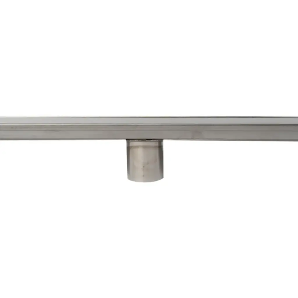18 Gauge premium grade 304 series stainless steel. Includes a removable basket strainer inside the drain which catches hair and other debris from entering your drain, allowing you to pop off the cover lift from the basket strainer and clean it out once in a while. 2" slip in drain diameter. This linear drain includes a solid cover with no hole or lines in it. The water drains from all four sides around it. Shower drain base not included but is required and available as model # ABDB55 in PVC or ABDB55CI in Cast Iron.