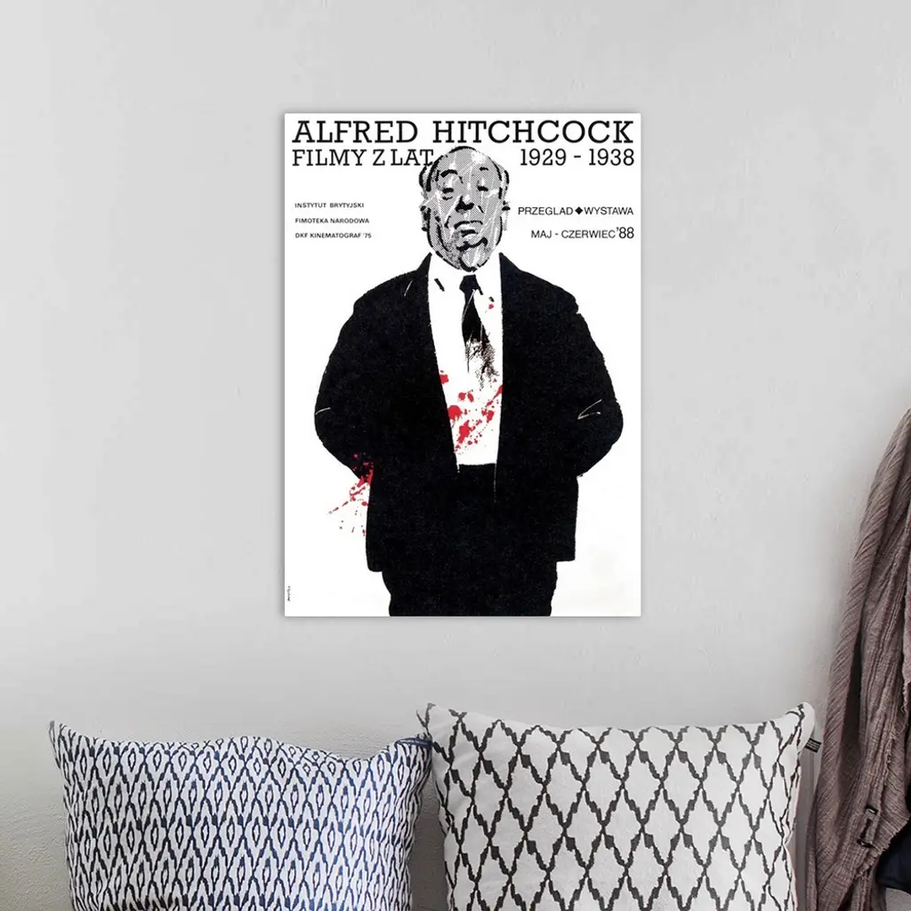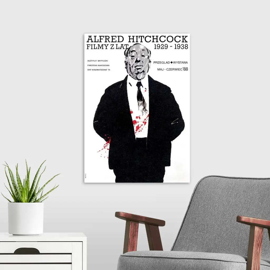 A minimalist poster that uses high contrast and a dramatic pop of color to advertise a Polish film festival celebrating the English director and master of suspenseful cinema.
