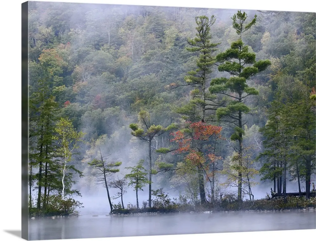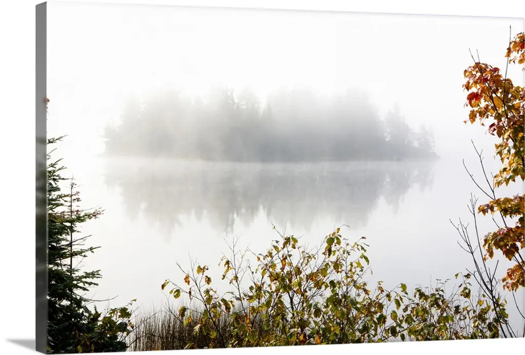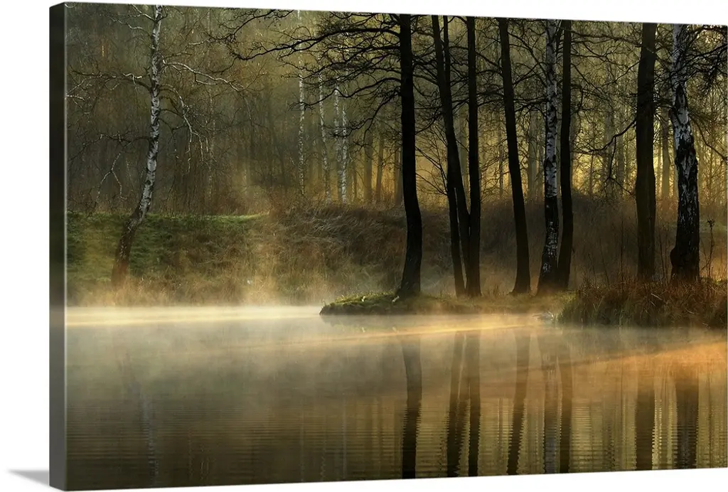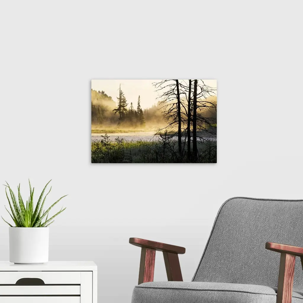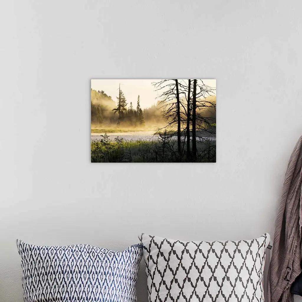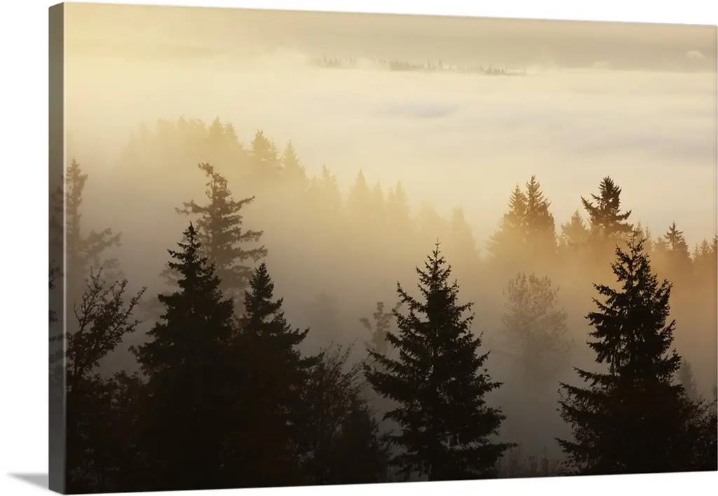 Big photo on canvas of a forest landscape covered in fog and bathed in various places with warm sunlight.