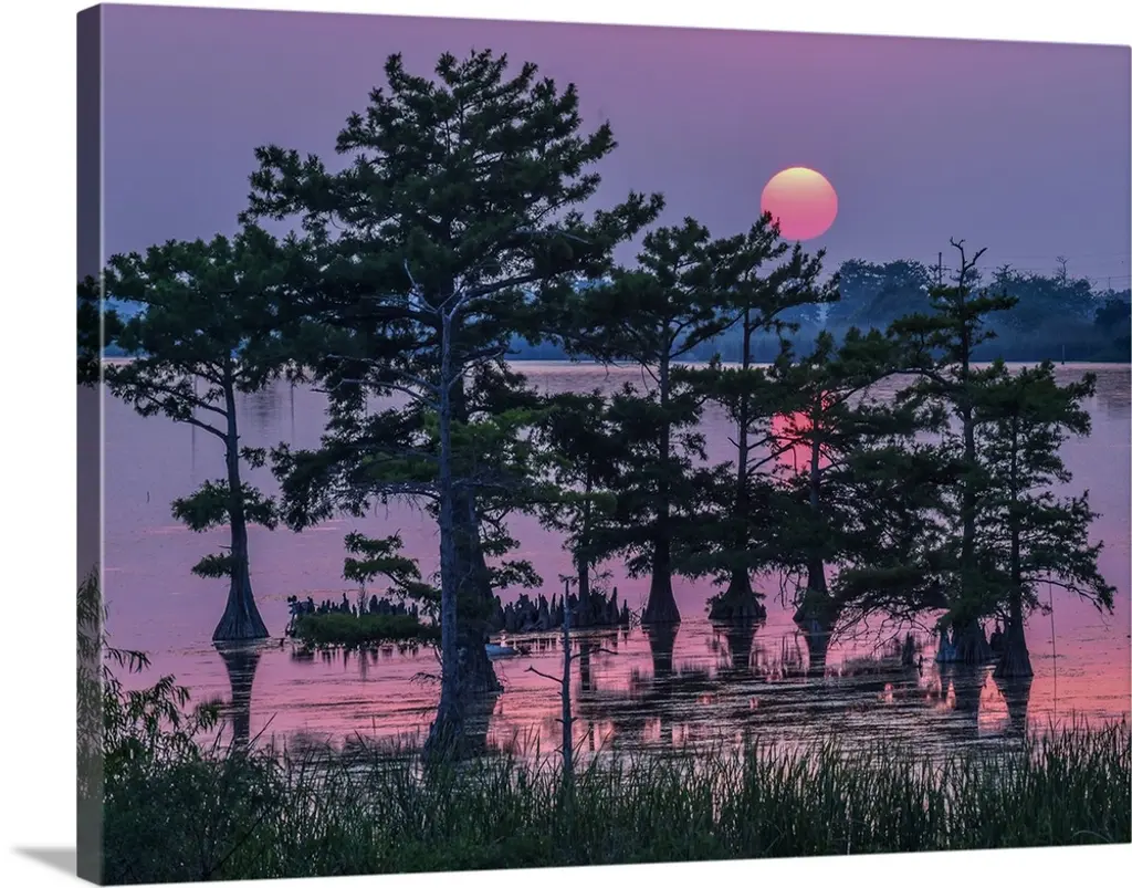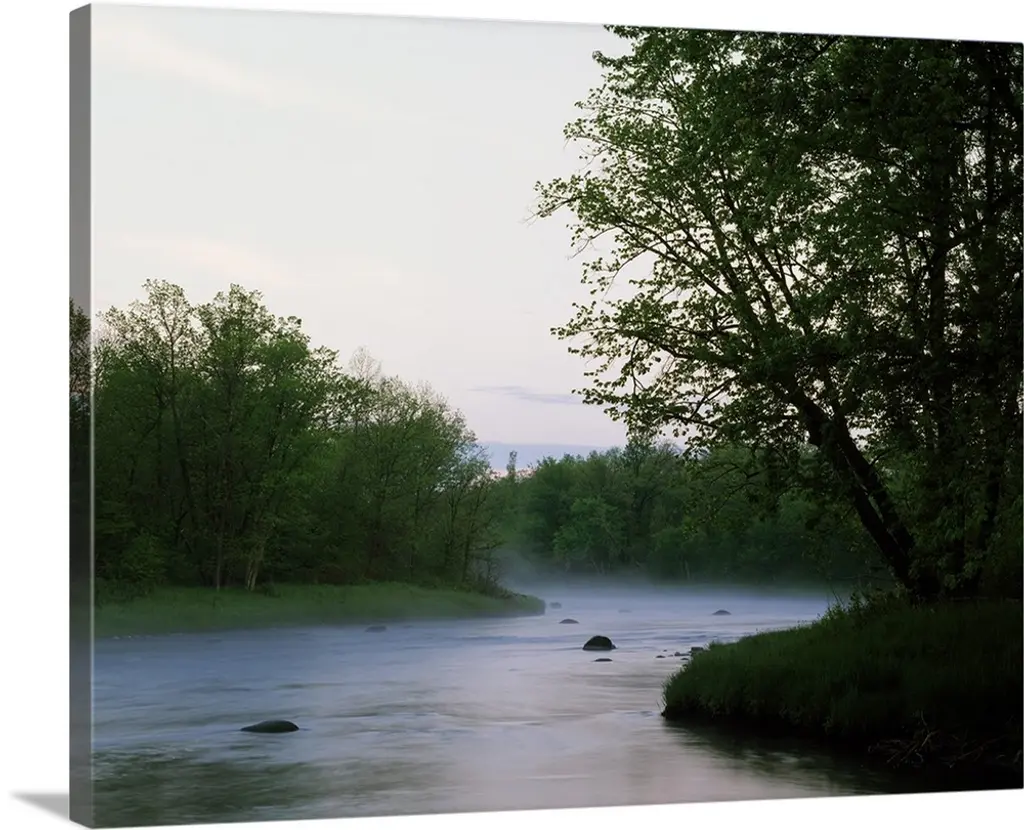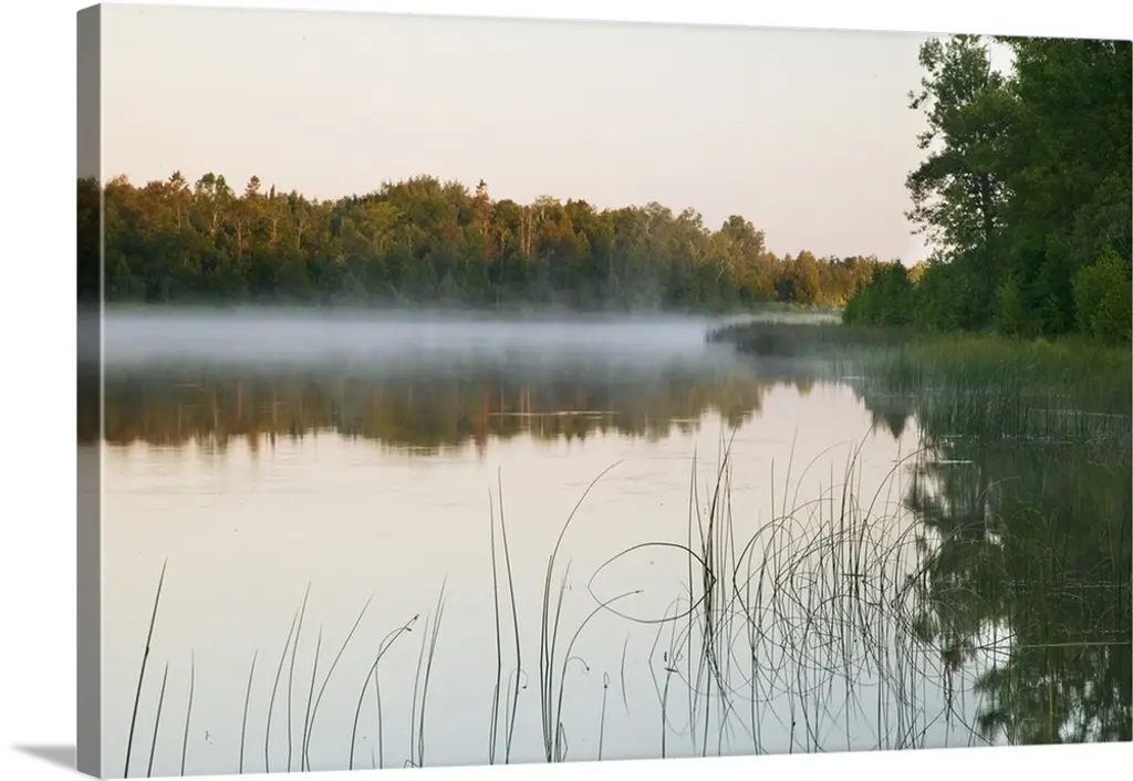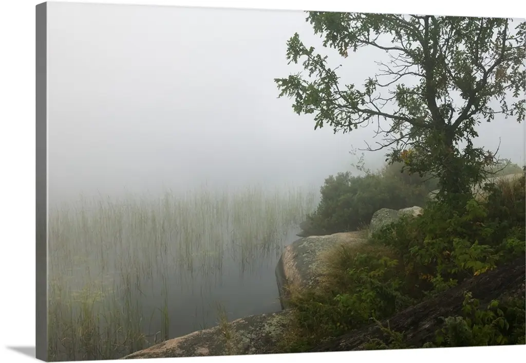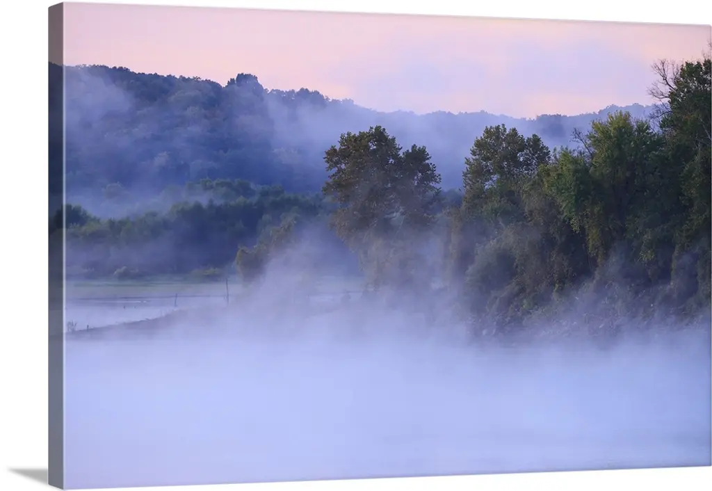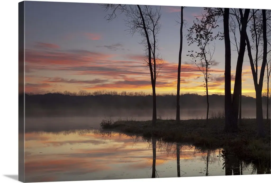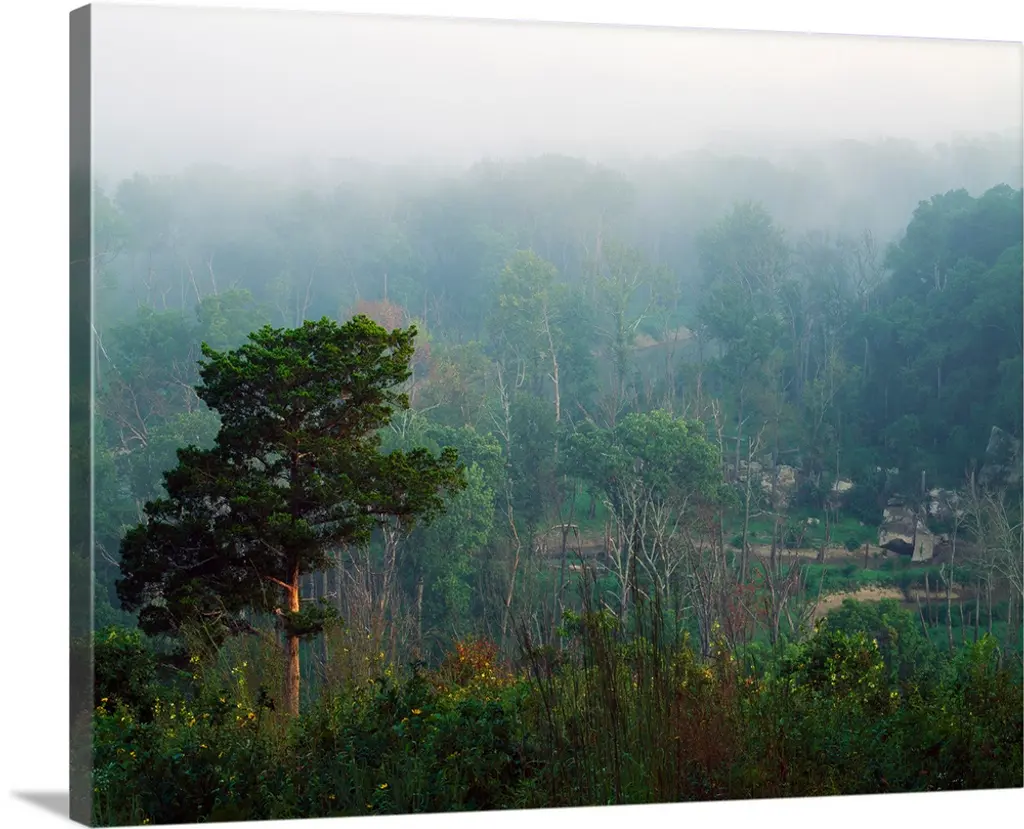 Big photo on canvas of a forest landscape covered in fog and bathed in various places with warm sunlight.