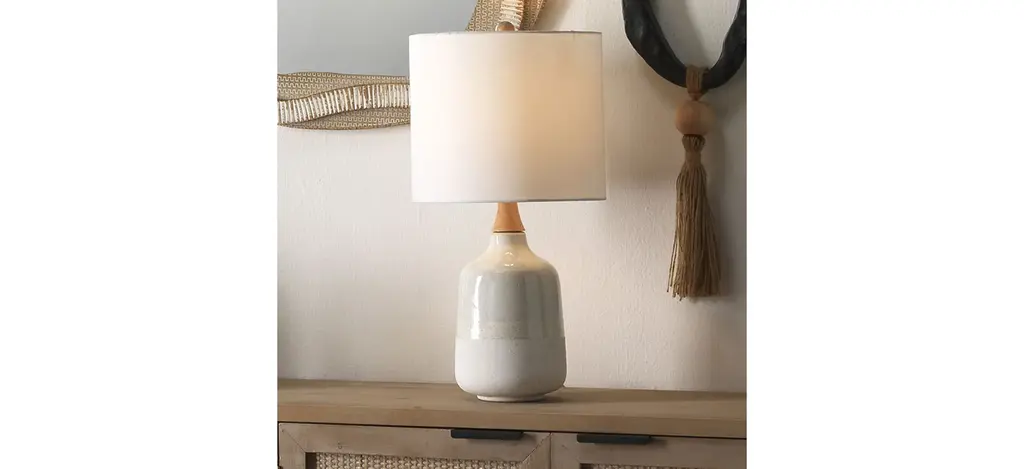 Inspired by mid-century modern design, the Alice One Table Lamp features layers of neutral colored glaze on a ceramic lamp body. The petite fixture embraces different textures for added interest. Starting with a wood grain neck, greige colored glaze on top, a beige horizontal stripe around the middle and finished with a raw unfinished off-white bottom, all made by hand.