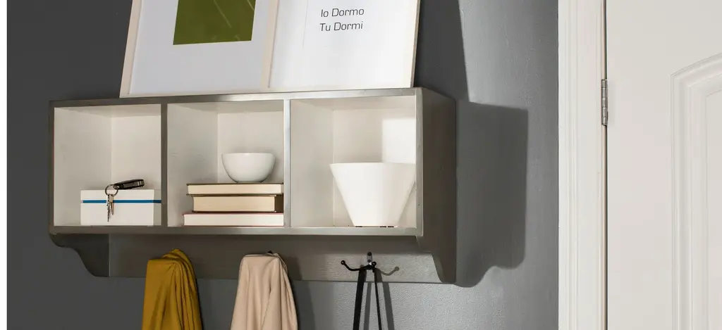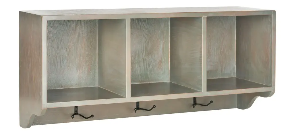 Reminiscent of schoolhouse cubbies, the Alice Wall Shelf is designed to minimize entry hall clutter, and keep kids organized. Made from poplar wood with an ash gray finish, this piece has three storage spaces for hats, gloves, or decorative accessories and hooks for coats and scarves.