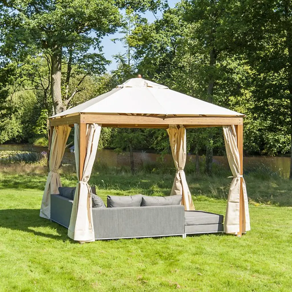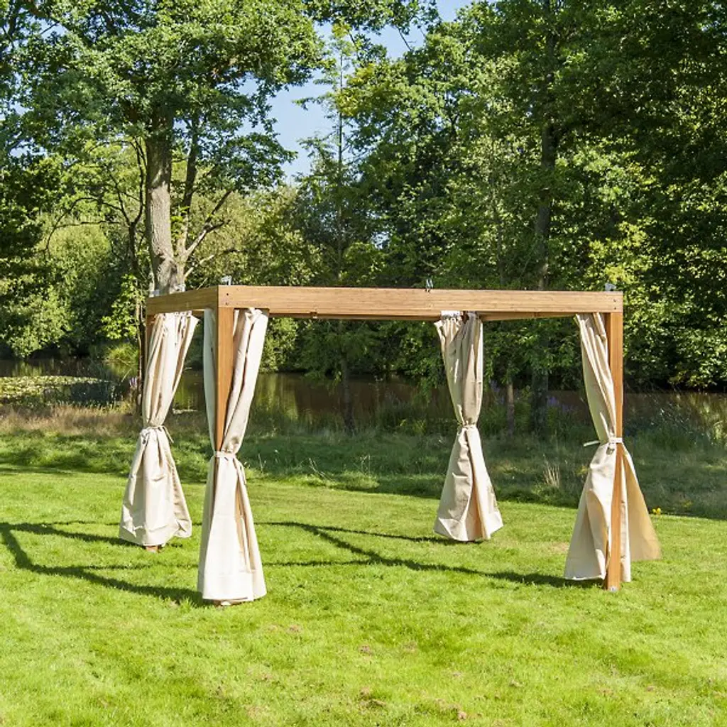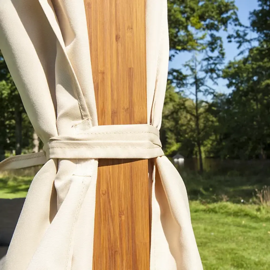 Relax in the fresh air and stay protected and dry with the Alize Rectangular Pavilion Bambrella. A tough structure framed in solid bamboo with steel bolt reinforcement, it incorporates an encompassing array of branches into a roof umbrella mount that suspends a rectangular canopy over the entire structure. Fashioned from a treated polyester called Spuncrylic, the canopy is resistant to the sun, stains, and water, while offering an ultraviolet protection factor of 50.