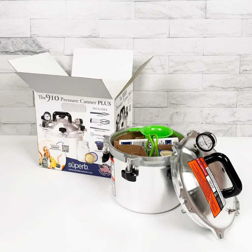 Our Best Pressure Canner and Tools in One Kit Begin your canning journey with the best equipment! Made in the USA, this canning kit includes the All American 10.5-Qt Pressure Canner with its exclusive metal-to-metal seal. (Other canners use gaskets that can crack or burn.) PLUS, it comes with top-notch canning supplies, like Superb jars, lids and bands. Kit includes all the essentials for canning: All American 10.5-Qt Pressure Canner/Cooker with Canning Rack. 3 Superb Regular-Mouth Pint Canning Jars. 12 Superb Regular-Mouth Canning Lids with Bands. Jar Wrench. Jar Lifter. Magnetic Lid Lifter. 12" Tongs. Wide Mouth Funnel. Note: Glass-top ranges are not designed for the high heat of canning. Features: Metal-to-Metal Seal - All American 10-Qt Pressure Canner has no gaskets to crack, burn, replace or clean ever! It seals steam-tight.. All Cast Aluminum for Generations of Use - The canner's sides are .25" thick. Bottoms are even thicker and machined for perfect surface-to-surface heat transfer. UL approved.. Simple and Safe to Use - There is no need for close supervision since pressure cannot exceed setting (5, 10 or 15 lbs). Over-pressure plug acts as back-up. Stay-cool Bakelite handles, easy-to-read pressure gauge and detailed owner's manual with recipes and canning hints.. Paired with Superb Canning Jars, Lids and Bands - Durable American glass jars are made with the highest standards for strength, clarity and thermal shock performance. Lids feature BlueSeal Integrity for more sealing power and to prevent buckling. Includes All the Essential Canning Tools - 5-piece tool set: Jar wrench, jar lifter, magnetic lid lifter, tongs, and wide mouth funnel.. More About Pressure Canning: Pressure canning is the only method recommended safe by the U.S.D.A. for low-acid foods such as vegetables, meats and fish. No matter how high you turn up the heat, boiling water cannot surpass 212 degrees F (even lower at high altitudes). All-American's Pressure Canners bring jar temperatures up to 250 degrees F at just 15 lbs sq. in. 100 percent bacteria kill guaranteed! All American 10.5-Qt Canner: Jar Capacity: 7 pt or 4 qt. Dimensions: 7-3/4"H x 10-1/2"ID (11-1/2"H with lid). Weight: 12 lb.
