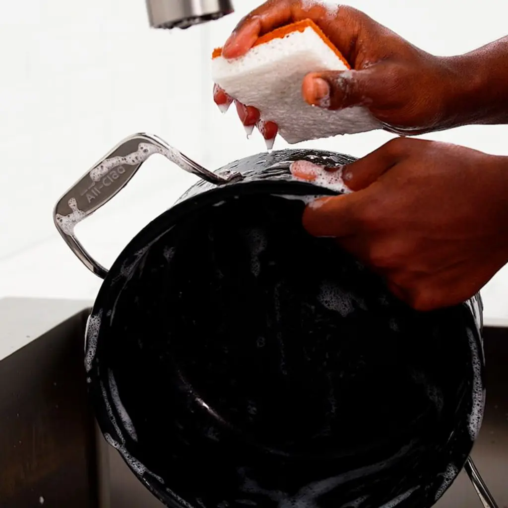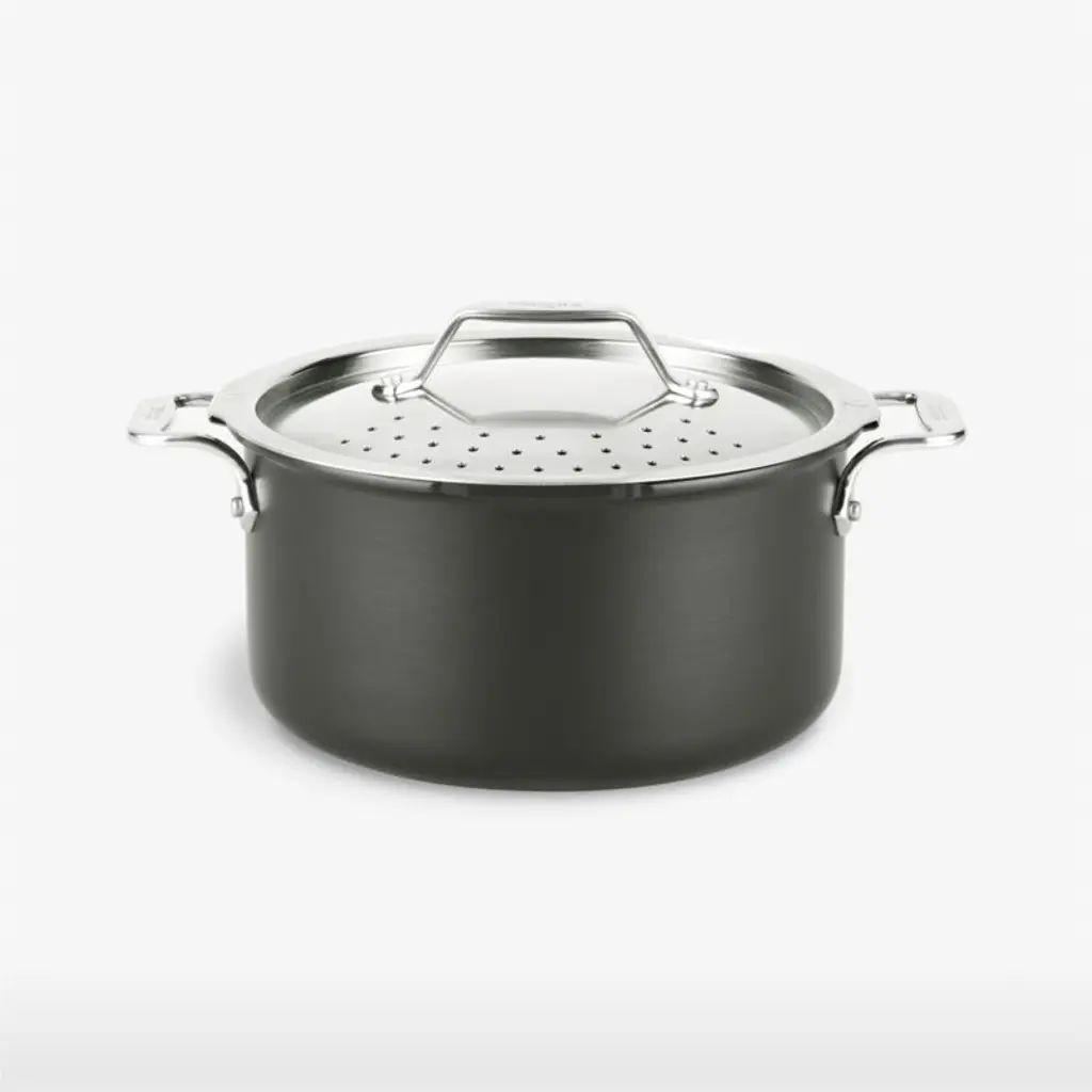 This generously sized multipot boils enough pasta, potatoes or beans for the whole household, then strains the food with ease thanks to the locking stainless steel strainer lid. Or use the hard-anodized aluminum pan to create one-pot meals, soups and stews. Interior measurement markings eliminate the need for measuring cups, and the multipot goes from the stove to the oven to accommodate multiple cooking methods. Three layers of non-stick finish allow for easy release of foods and quick cleanup after meals.All-Clad has been crafting cookware since 1971.Need help choosing? View our All-Clad comparison chart.View all All-Clad non-stick cookware