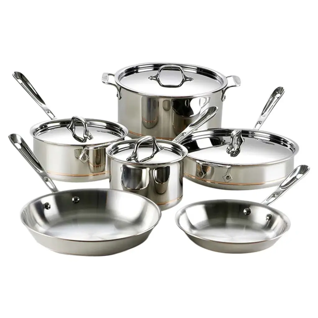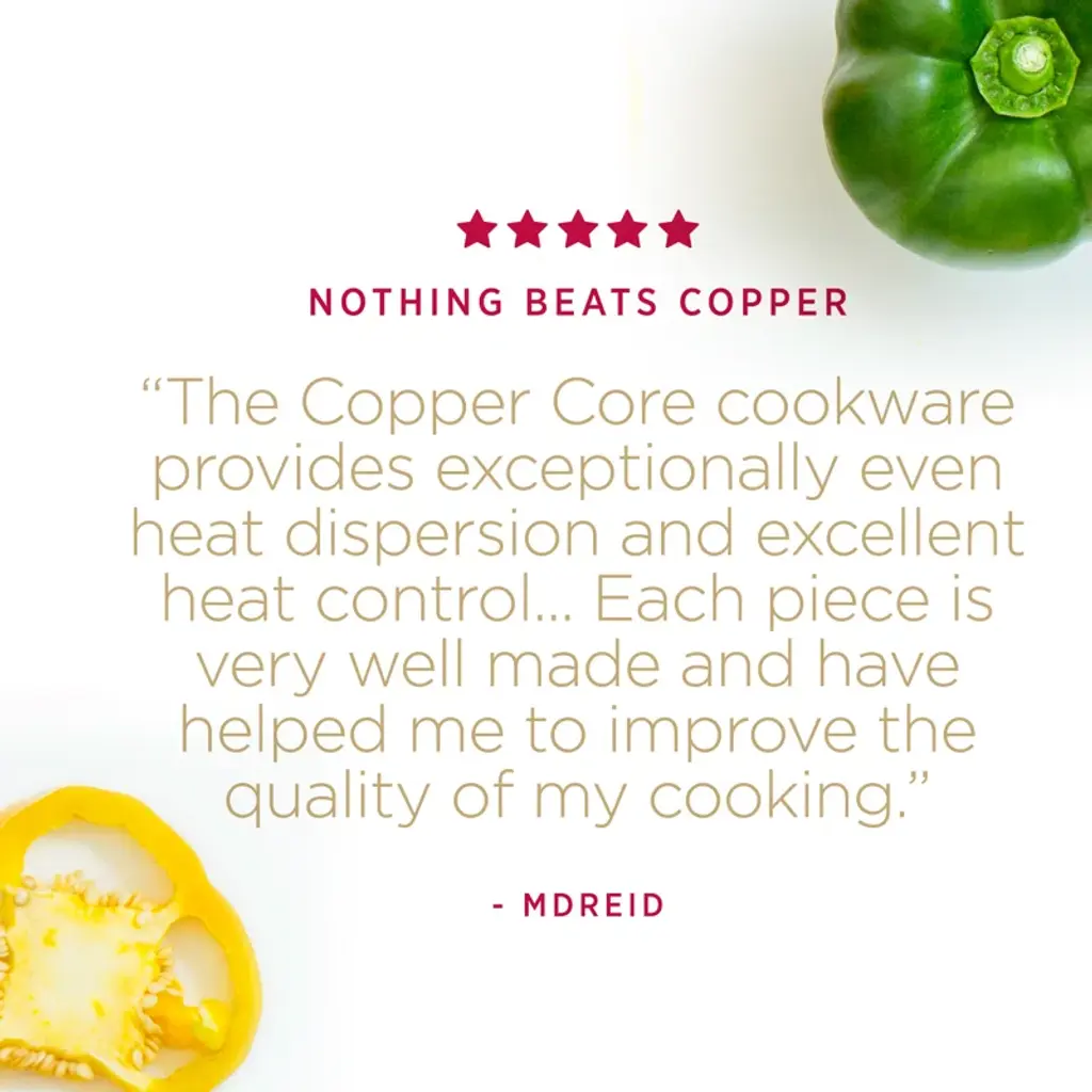 Kitchen connoisseurs will enjoy elegant design and high performance with this cookware set. Copper core combines the heat conductivity of copper with the cleaning ease of 18/10 stainless steel, making it a smart and versatile choice for the well-appointed kitchen. This 10-Piece set--ideal for serious home cooks or experienced professionals--includes 8- and 10" fry pans, 2- and 3 Qt. saucepans with lids, a 3 Qt. sauté pan with lid and an 8 Qt. stockpot with lid. Each piece in the set features heavy-duty 5-Ply construction designed for rapid and even heat distribution.