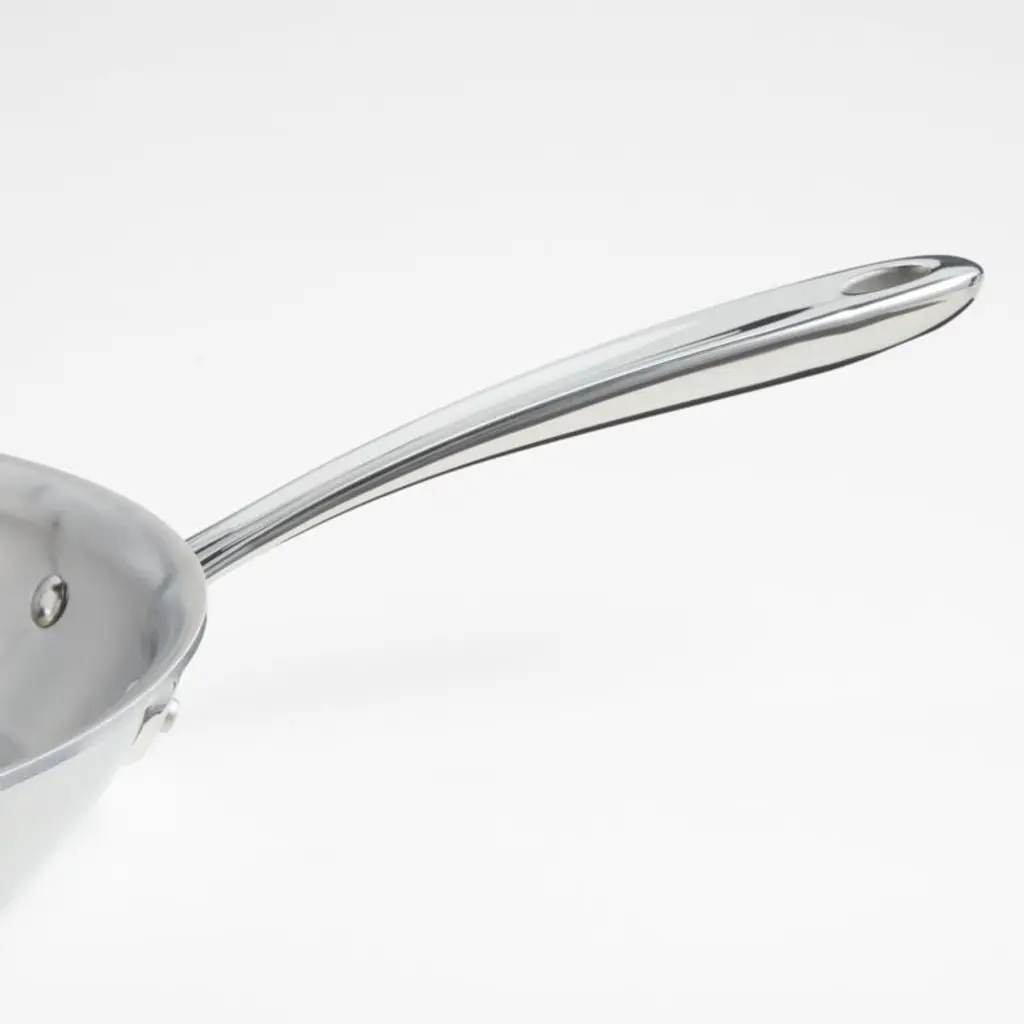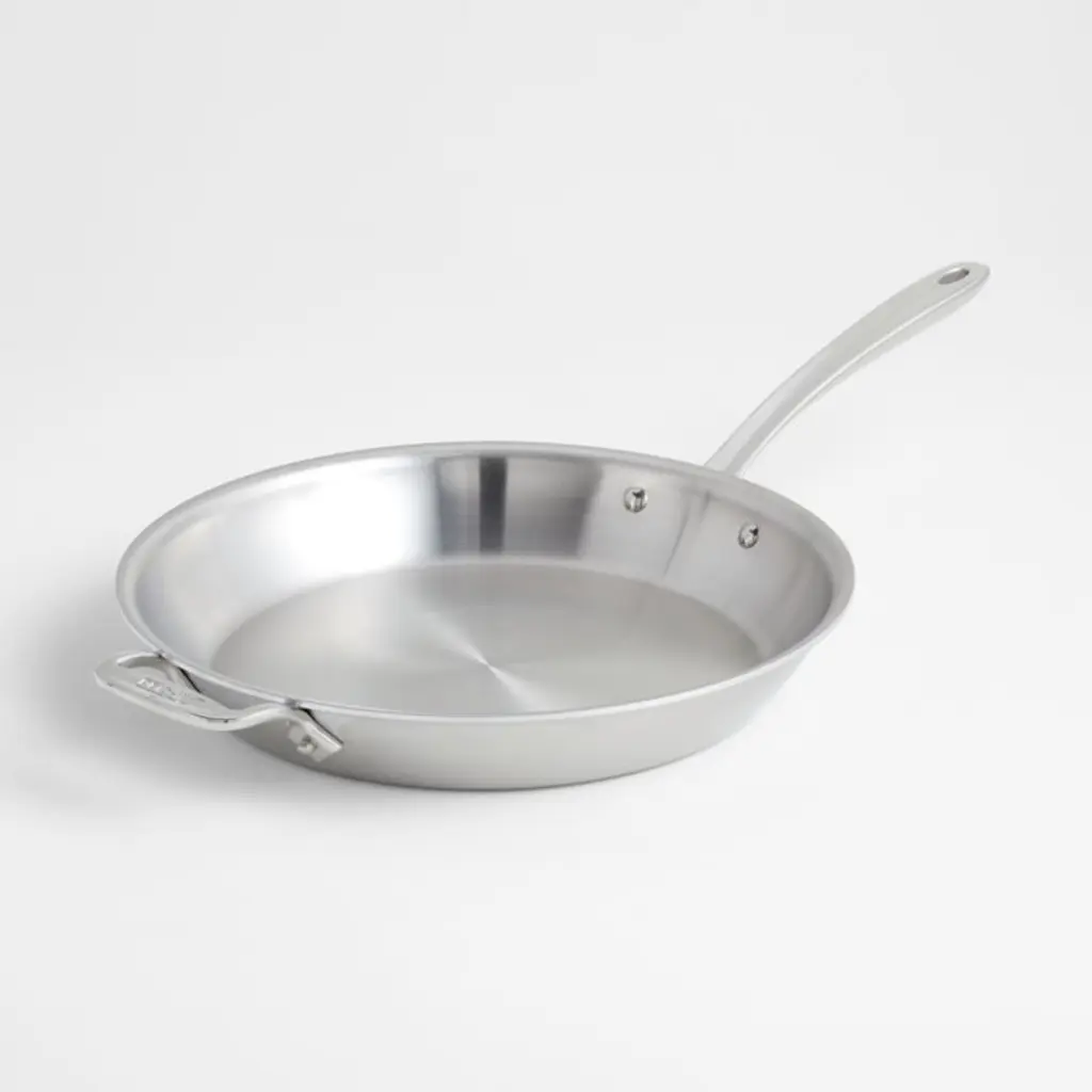 Sear, brown and saute in a premium fry pan designed with a three-ply construction for rapid and even heat distribution. The cooking surface and exterior are premium stainless steel for impeccable frying, while the thick-gauge aluminum core heats quickly. Oven-safe to high temperatures, the skillet boasts a securely riveted handle and a drip-free pouring rim that neatly serves risotto, stir fries and scrambled eggs. A Crate & Barrel exclusive, the frying pan boasts a unique contoured comfort handle and brushed stainless steel exterior. For a well-rounded kitchen, add other hand-picked pieces from our curated d3 cookware collection.Need help choosing? View our All-Clad comparison chart.View all All-Clad productsAll-Clad has been crafting cookware since 1971.