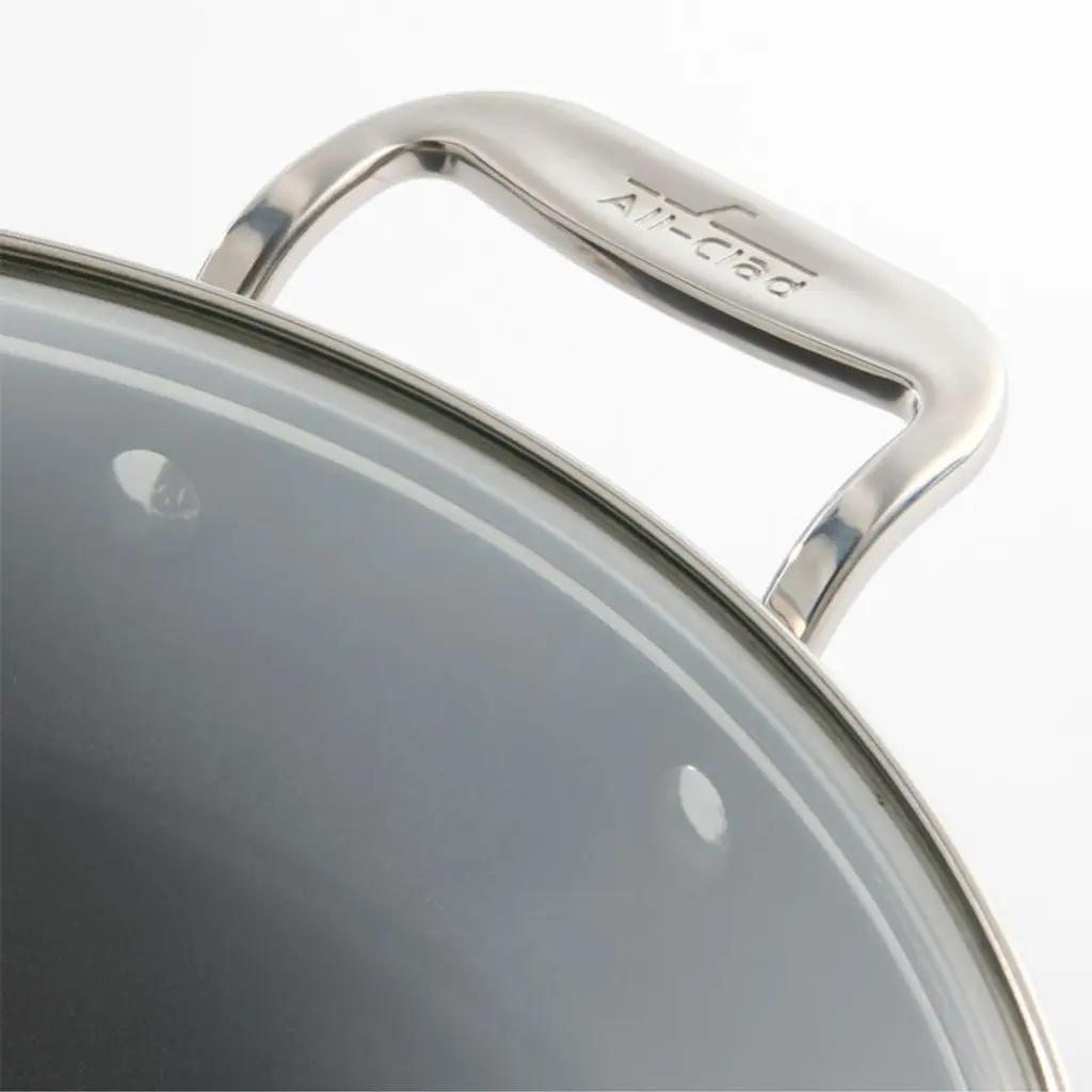 Fry like an expert. Anodized to absorb, distribute and transfer heat evenly and efficiently, this frying pan sautees onions, fries pancakes and bakes frittatas to perfection. The fast-heating aluminum pan boasts a stainless steel base that resists warping and heats evenly. Comfort-grip stainless steel handles provide a sturdy grip as you stir and flip, while flared sides allow for one-handed sauteing. Top with the glass lid to seal in heat and moisture. Three layers of durable non-stick finish ensure easy release and quick cleanup in the dishwasher.All-Clad has been crafting cookware since 1971.