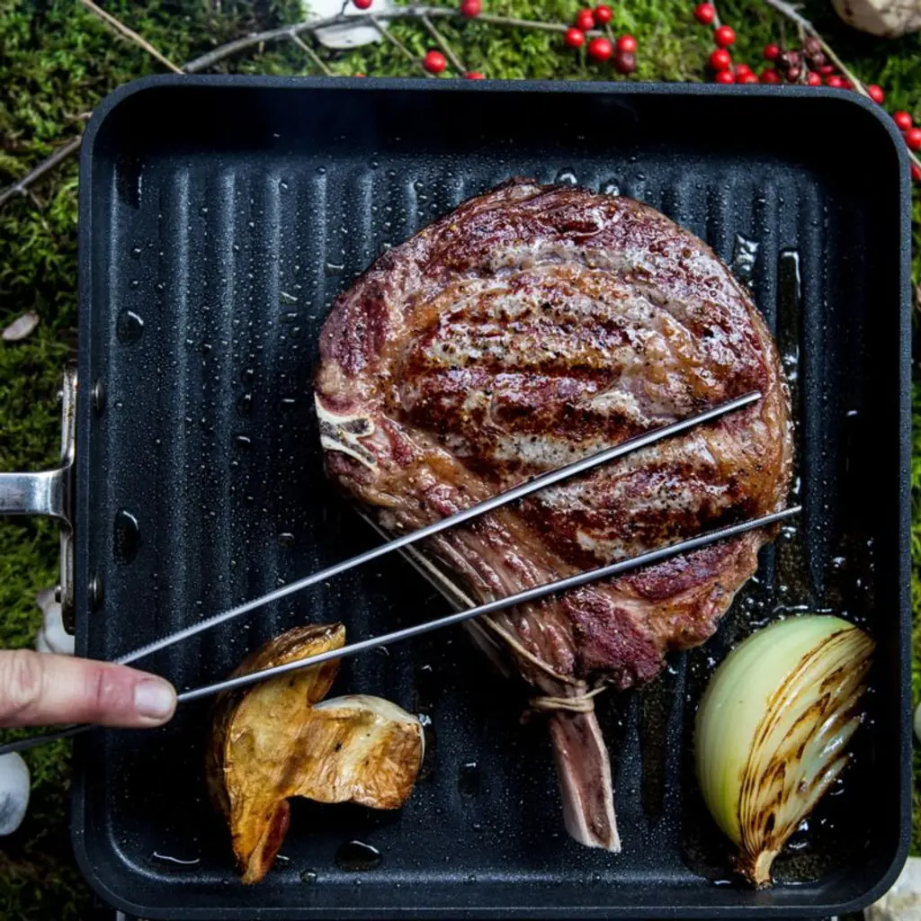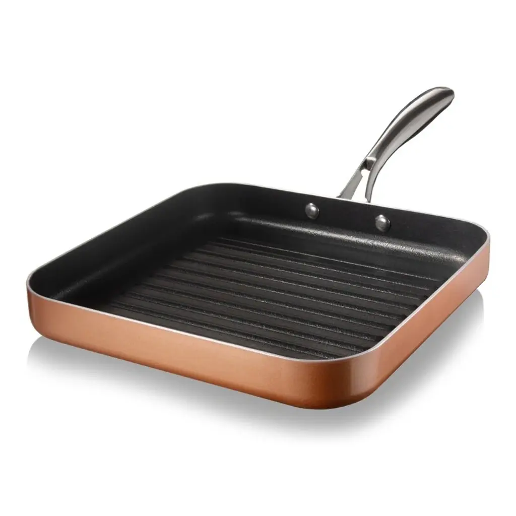Anodized to absorb and distribute heat quickly and efficiently, this ridged pan is ideal for searing and grilling burgers, zucchini slices, cauliflower steaks and french toast to perfection while draining away excess fat. A generous rim corrals ingredients and prevents grease splatters, and the long riveted stainless steel handle allows for safe, easy cooking. The triple-bonded nonstick surface cooks at high heat with oils to develop foods with full, rich flavor, color and crisp texture.Need help choosing? View our All-Clad comparison chart.View all All-Clad products