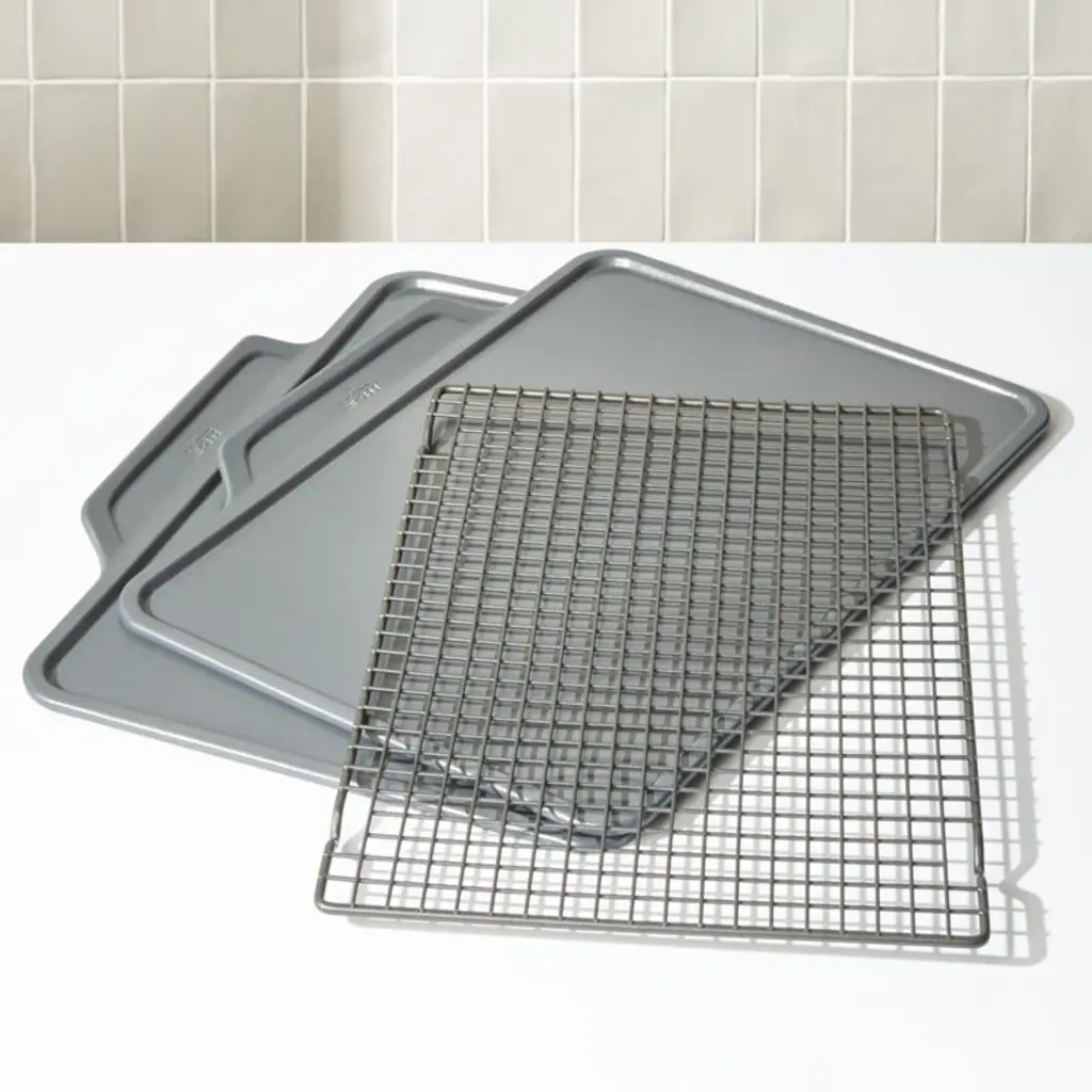 Bake multiple batches of snickerdoodles, blondies and chocolate chip cookies with this helpful three-piece set. Constructed of heavy-gauge aluminized steel, the two cookie sheets promote even baking and browning, while the rack allows cookies and other baked goods to cool quickly and crisp perfectly. Coated in a ceramic-reinforced non-stick finish, the durable pan and rack release cookies easily and resist scratches. Oversized, angled handles provide a safe grip even when you're wearing oven mitts.All-Clad has been crafting cookware since 1971.