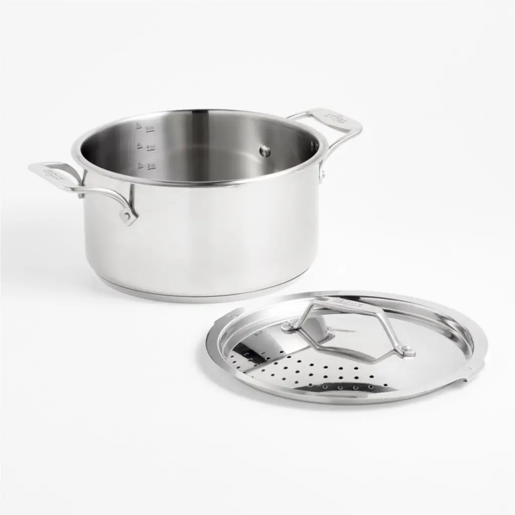 Expertly prepare pasta, soup and sauces as well as steamed vegetables and seafood with this multifunctional pot. Crafted of stainless steel, the multipot has a wide, heavy-duty base for efficient heating. Wide handles allow for easy handling even with pot holders. The pot features interior measurement markings, and the straining lid locks into place to easily drain water from noodles, potatoes, corn on the cob and more.All-Clad has been crafting cookware since 1971.