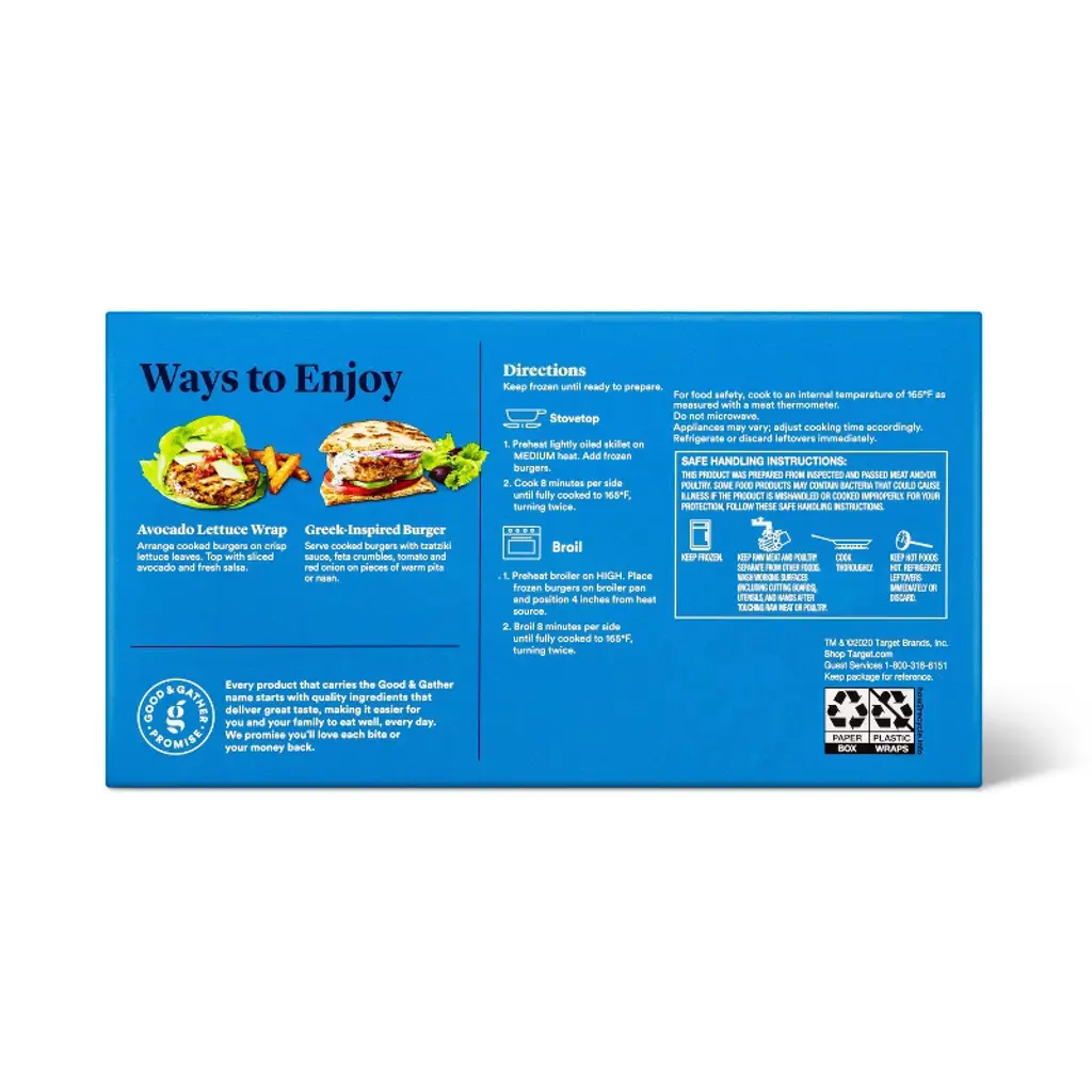 Fire up the grill and try a different spin on a burger with Good & Gather™ All-Natural Turkey Burgers. These frozen turkey burger patties contain no artificial ingredients, minimally processed and are made from turkey raised with no antibiotics,**no added hormones or steroids† and vegetarian fed.** With six burgers in each 32-ounce package, they're great for serving up at your next backyard barbecue as an alternative option to beef. Enjoy one of these turkey burgers on a bun with your favorite standard burger toppings, or try it as a lettuce wrap topped with a crisp, acidic slaw for added crunch.*Federal Regulations prohibit the use of hormones or steroids in poultry.**Turkey used never administered antibiotics and are fed a vegetarian diet.Every product that carries the Good & Gather™ name starts with quality ingredients that deliver great taste, making it easier for you and your family to eat well, every day. We promise you’ll love each bite, or your money back.DirectionsKeep frozen until ready to prepare.Stovetop1. Preheat lightly oiled skillet on MEDIUM heat. Add frozen burgers.2. Cook 8 minutes per side until fully cooked to 165°F, turning twice.Broil1. Preheat broiler on HIGH. Place frozen burgers on broiler pan and position 4 inches from heat source.2. Broil 8 minutes per side until fully cooked to 165°F, turning twice.For food safety, cook to an internal temperature of 165F as measured with a meat thermometer. Do not microwave. Appliances may vary; adjust cooking time accordingly. Refrigerate or discard leftovers immediately.Ways to EnjoyAvocado Lettuce Wrap - Arrange cooked burgers on crisp lettuce leaves. Top with sliced avocado and fresh salsa.Greek-Inspired Burger - Serve cooked burgers with tzatziki sauce, feta crumbles, tomato and red onion on pieces of warm pita or naan."