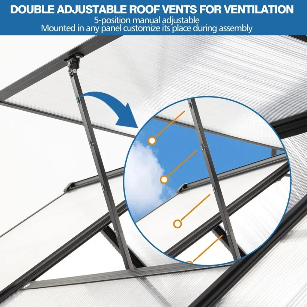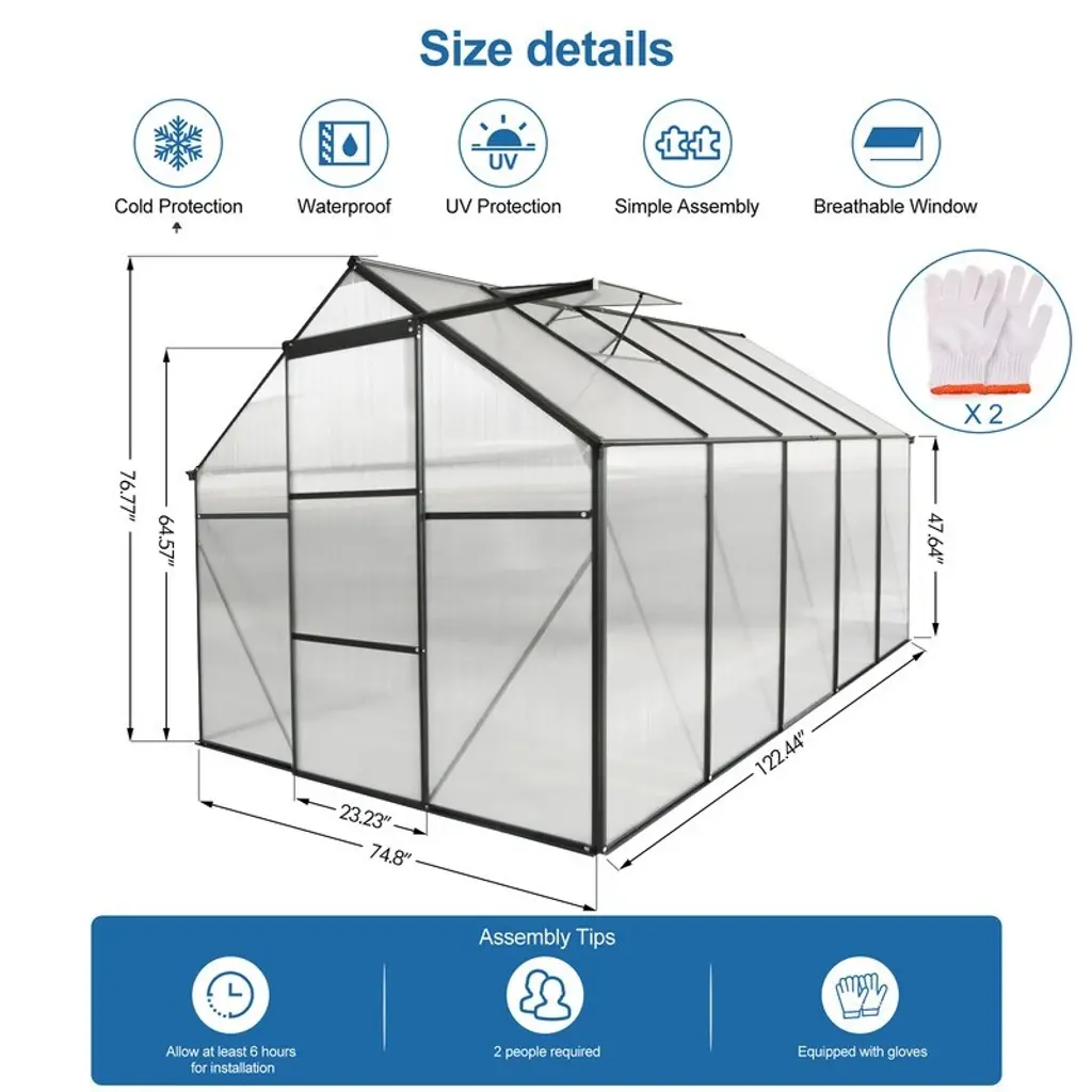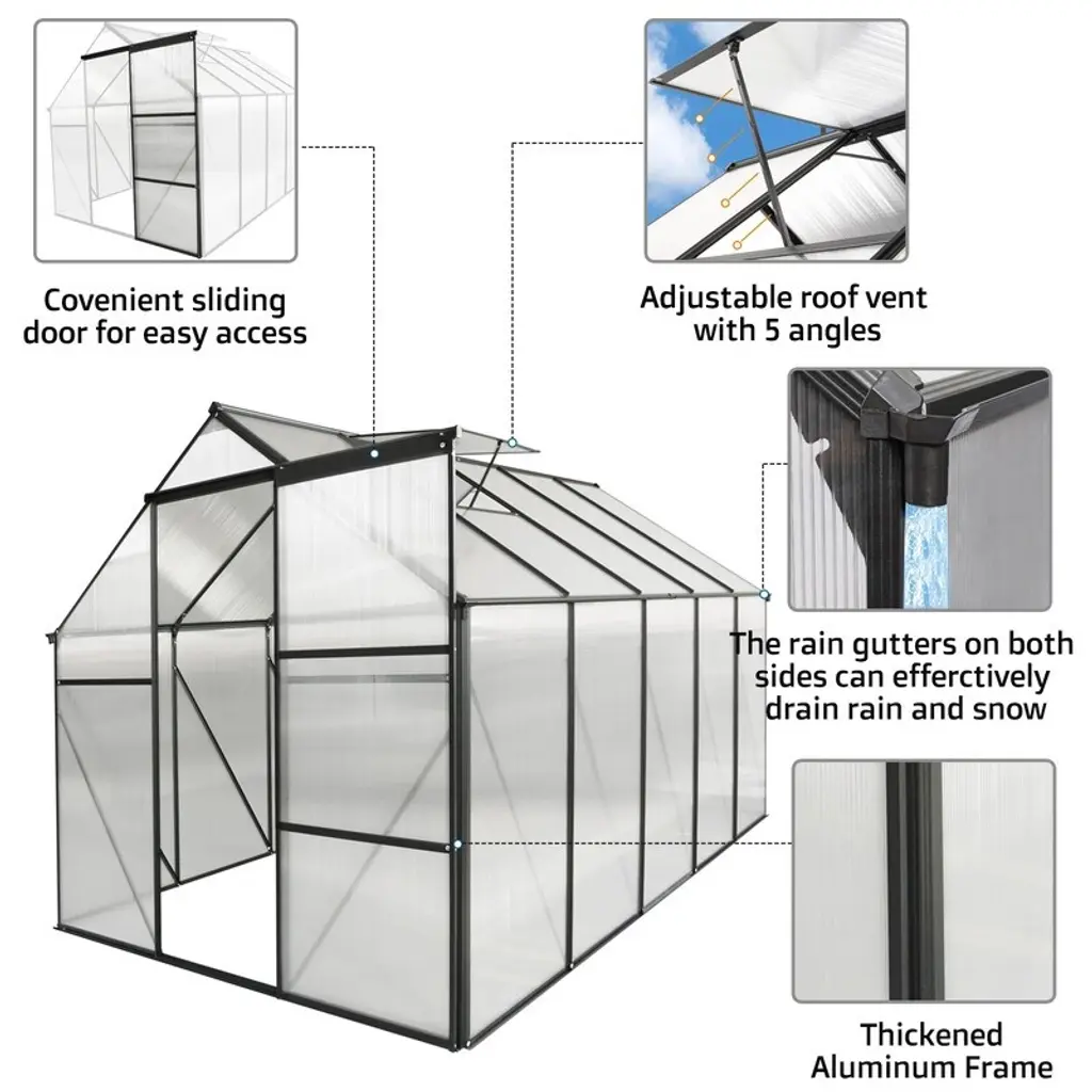 Product Features· Drainage System & Galvanized Base The drainage gutter system can effectively drain water from the greenhouse to the outside. The sloped roof won't accumulate water on the top. alvanized base can be better fixed in the soil and protects the greenhouse from bad weather.· Sliding Door The sliding door makes you easier to get in and out, also protects your plants or flowers from animals or pets getting inside. All detailed instruction are included already, so you can simply follow instruction to assemble.· Adjustable Roof An adjustable roof is convenient for insects to come inside to collect pollen, helping to sow seeds and also providing fresh air at all time. A great ventilation system is built for your plants.· Heavy-duty & Durable Frame The 4mm thick polycarbonate board can withstand outdoor temperature from -20℃ to 70 ℃, allowing enough sunlight to pass through and isolating most UV rays. The aluminum alloy frame with powder coating is more durable, won't get rust. The panels allow up to 70% light transmission for optimal plant growth while blocking out over 99.9% of harmful UV rays.· Walk-in Spacious Greenhouse The ideal growing environment is large enough for you to plant numbers of plants, flexibly arrange your plants and flowers inside. Protecting your plants from frost and excessive heat, the green house creates a greenhouse effect to achieve and the best results of planting.Dimensions6X6FTAssembled Length (in.):74.80Assembled Width (in.):74.80Assembled Height (in.):76.77Weight (lbs.):46.206X8FTAssembled Length (in.):74.80Assembled Width (in.):98.43Assembled Height (in.):76.77Weight (lbs.):52.836X10FTAssembled Length (in.):74.80Assembled Width (in.):122.44Assembled Height (in.):76.77Weight (lbs.):63.866X12FTAssembled Length (in.):74.80Assembled Width (in.):146.06Assembled Height (in.):76.77Weight (lbs.):75.42Notice:Manual measurement has been used, there may be some reasonable error.Due to factors such as display equipment and shooting environment, the color of the item may be slightly different from the picture, which is a normal phenomenon, please refer to the actual item.Please confirm whether the size meets your requirements before you buy it!Contact US:After-sales Email Address: dhalcomb@doorise.comIf the item comes with any defect, damage(include damaged in transit) or missing partsand, please contact us with detailed images for free replacement or refund.