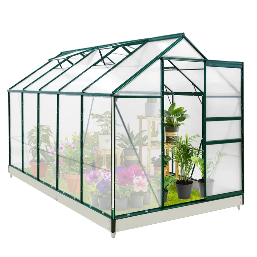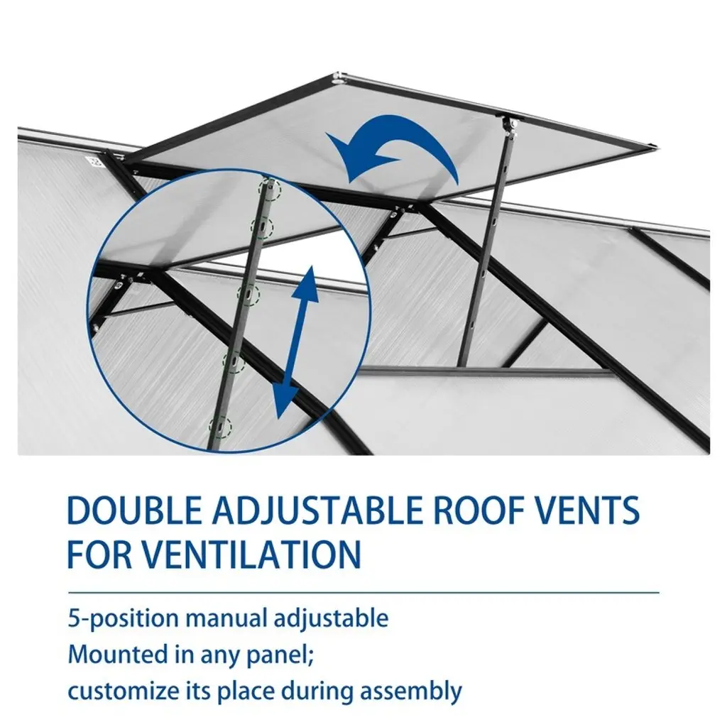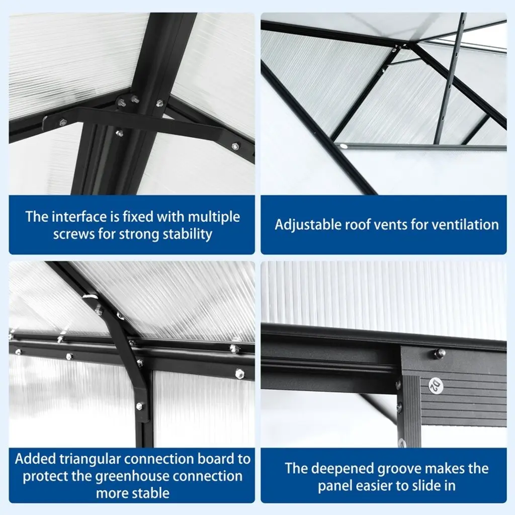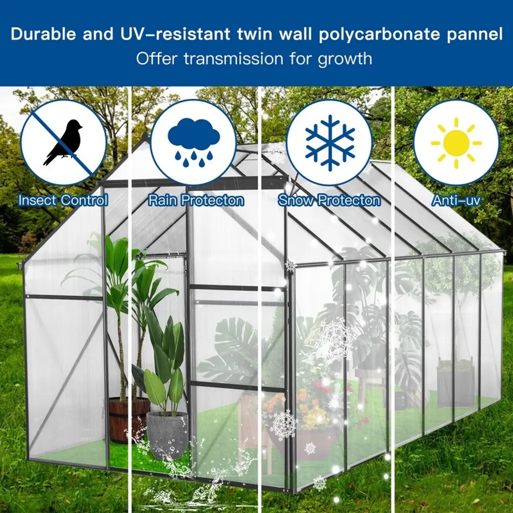 Product Features· Drainage System & Galvanized Base The drainage gutter system can effectively drain water from the greenhouse to the outside. The sloped roof won't accumulate water on the top. alvanized base can be better fixed in the soil and protects the greenhouse from bad weather.· Sliding Door The sliding door makes you easier to get in and out, also protects your plants or flowers from animals or pets getting inside. All detailed instruction are included already, so you can simply follow instruction to assemble.· Adjustable Roof An adjustable roof is convenient for insects to come inside to collect pollen, helping to sow seeds and also providing fresh air at all time. A great ventilation system is built for your plants.· Heavy-duty & Durable Frame The 4mm thick polycarbonate board can withstand outdoor temperature from -20℃ to 70 ℃, allowing enough sunlight to pass through and isolating most UV rays. The aluminum alloy frame with powder coating is more durable, won't get rust. The panels allow up to 70% light transmission for optimal plant growth while blocking out over 99.9% of harmful UV rays.· Walk-in Spacious Greenhouse The ideal growing environment is large enough for you to plant numbers of plants, flexibly arrange your plants and flowers inside. Protecting your plants from frost and excessive heat, the green house creates a greenhouse effect to achieve and the best results of planting.Dimensions6X6FTAssembled Length (in.):74.80Assembled Width (in.):74.80Assembled Height (in.):76.77Weight (lbs.):46.206X8FTAssembled Length (in.):74.80Assembled Width (in.):98.43Assembled Height (in.):76.77Weight (lbs.):52.836X10FTAssembled Length (in.):74.80Assembled Width (in.):122.44Assembled Height (in.):76.77Weight (lbs.):63.866X12FTAssembled Length (in.):74.80Assembled Width (in.):146.06Assembled Height (in.):76.77Weight (lbs.):75.42Notice:Manual measurement has been used, there may be some reasonable error.Due to factors such as display equipment and shooting environment, the color of the item may be slightly different from the picture, which is a normal phenomenon, please refer to the actual item.Please confirm whether the size meets your requirements before you buy it!Contact US:After-sales Email Address: dhalcomb@doorise.comIf the item comes with any defect, damage(include damaged in transit) or missing partsand, please contact us with detailed images for free replacement or refund.
