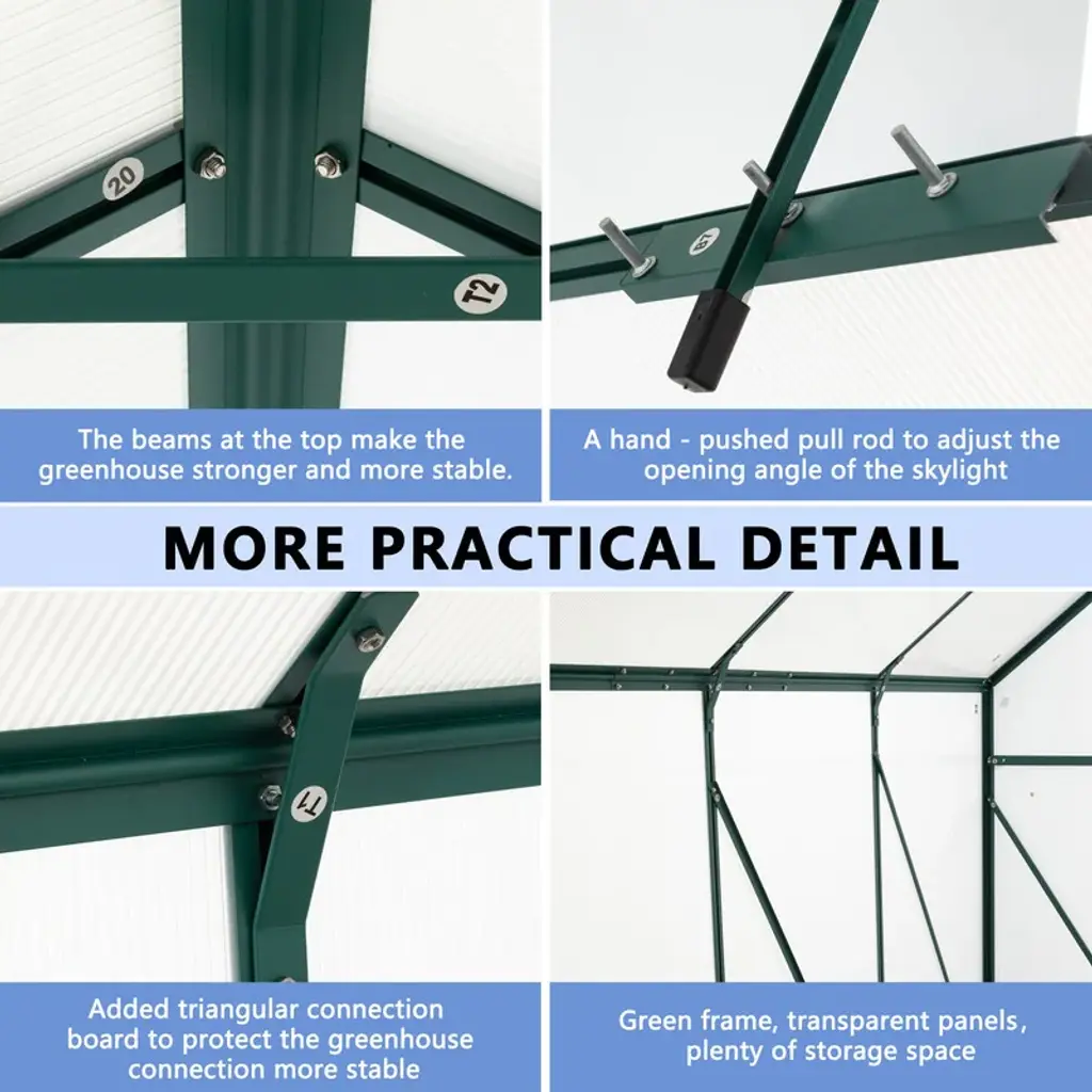 Product Features· Drainage System & Galvanized Base The drainage gutter system can effectively drain water from the greenhouse to the outside. The sloped roof won't accumulate water on the top. alvanized base can be better fixed in the soil and protects the greenhouse from bad weather.· Sliding Door The sliding door makes you easier to get in and out, also protects your plants or flowers from animals or pets getting inside. All detailed instruction are included already, so you can simply follow instruction to assemble.· Adjustable Roof An adjustable roof is convenient for insects to come inside to collect pollen, helping to sow seeds and also providing fresh air at all time. A great ventilation system is built for your plants.· Heavy-duty & Durable Frame The 4mm thick polycarbonate board can withstand outdoor temperature from -20℃ to 70 ℃, allowing enough sunlight to pass through and isolating most UV rays. The aluminum alloy frame with powder coating is more durable, won't get rust. The panels allow up to 70% light transmission for optimal plant growth while blocking out over 99.9% of harmful UV rays.· Walk-in Spacious Greenhouse The ideal growing environment is large enough for you to plant numbers of plants, flexibly arrange your plants and flowers inside. Protecting your plants from frost and excessive heat, the green house creates a greenhouse effect to achieve and the best results of planting.Dimensions6 x 8 FT Assembled Length (in.): 74.80Assembled Width (in.):98.43Assembled Height (in.):76.77Weight (lbs.): 52.936X10FTAssembled Length (in.): 74.80Assembled Width (in.):124.44Assembled Height (in.):76.77Weight (lbs.): 65.316X12FTAssembled Length (in.): 74.80Assembled Width (in.):146.06Assembled Height (in.):76.77Weight (lbs.): 76.07Notice:Manual measurement has been used, there may be some reasonable error.Due to factors such as display equipment and shooting environment, the color of the item may be slightly different from the picture, which is a normal phenomenon, please refer to the actual item.Please confirm whether the size meets your requirements before you buy it!Contact US:After-sales Email Address: dhalcomb@doorise.comIf the item comes with any defect, damage(include damaged in transit) or missing partsand, please contact us with detailed images for free replacement or refund.