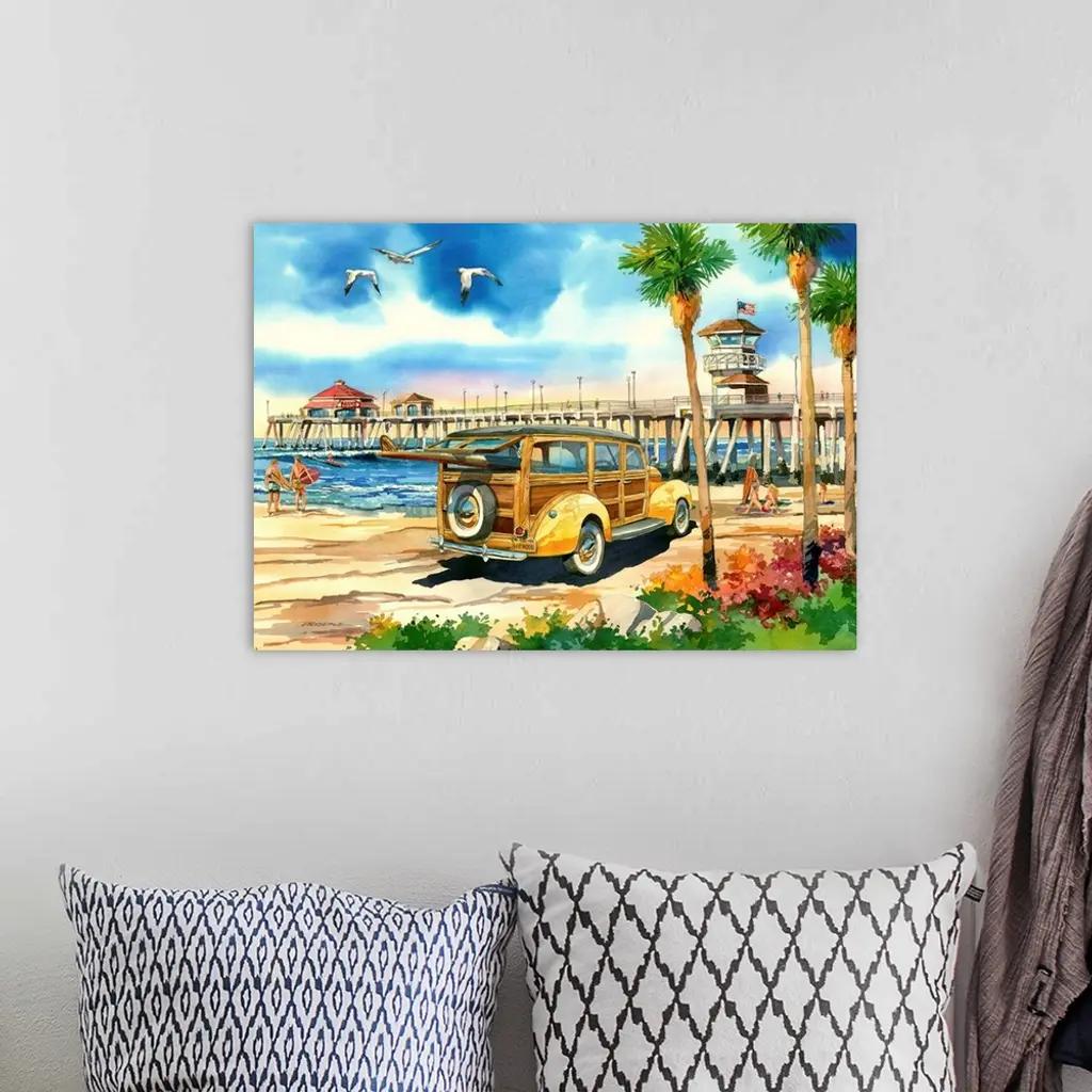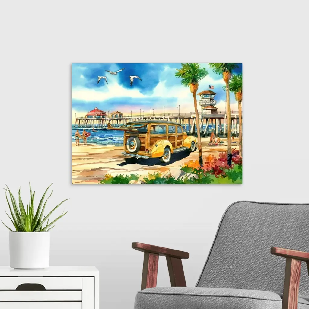 Watercolor of a classic woodie wagon on the beach at Surf City, Huntington Beach, CA.