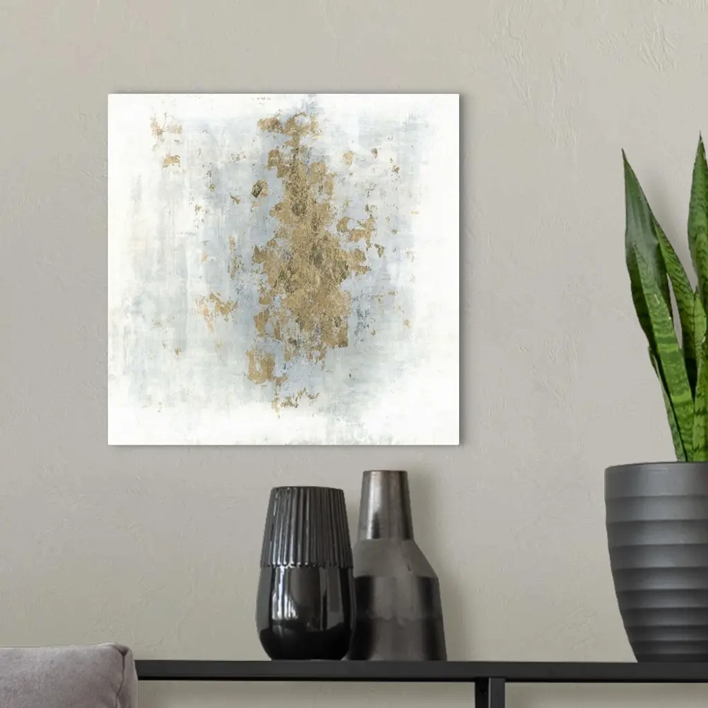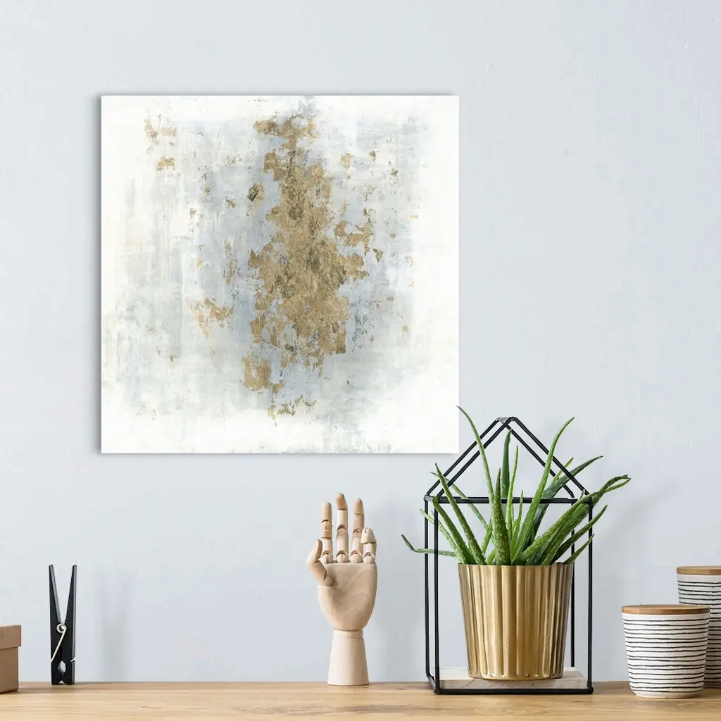 Square abstract art with a cloudy blue and white background and gold foil center.