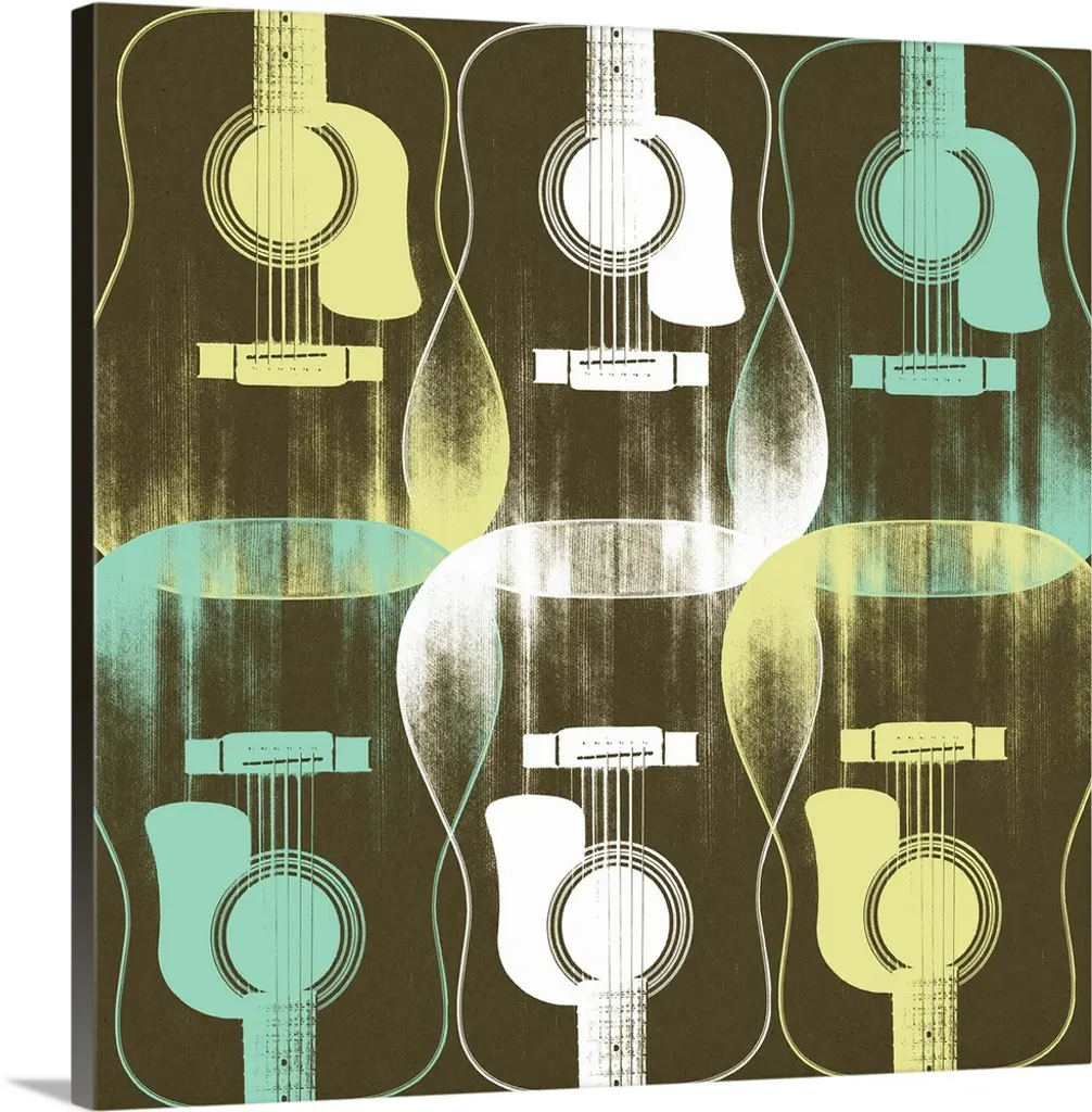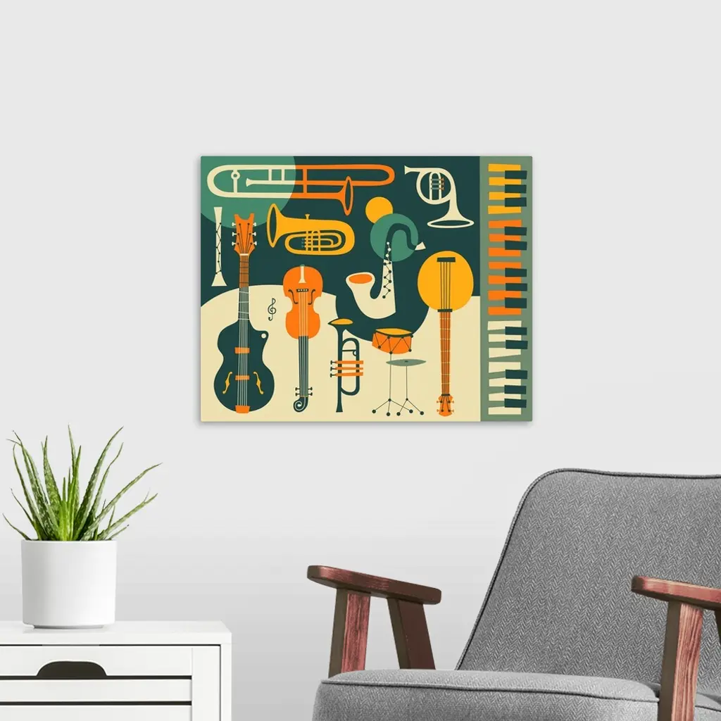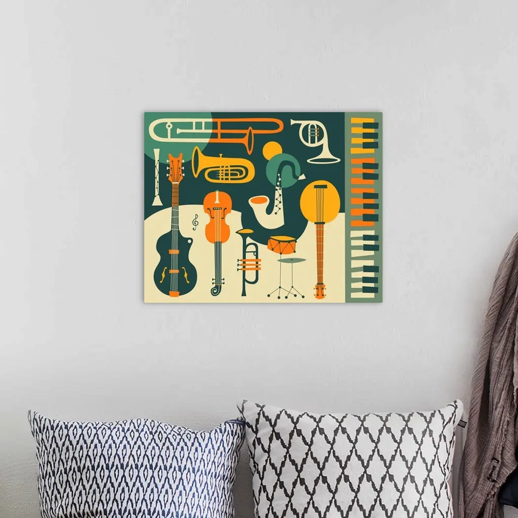 Retro illustration of musical instruments in blue, orange, gold, and cream hues.