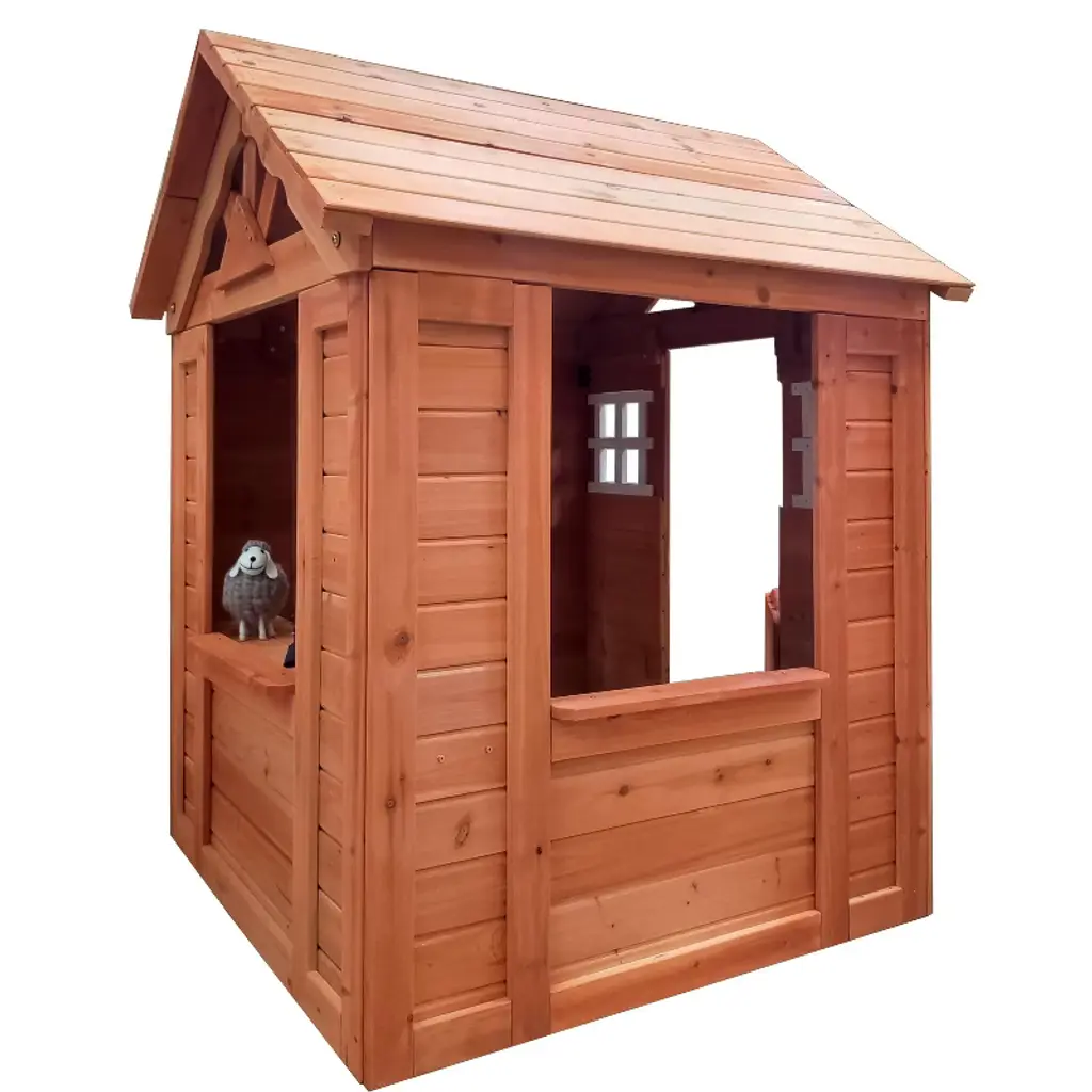 All Wooden Kids Playhouse With 2 Windows And Flowerpot Holder,42"lx46"wx55"h,golden Red