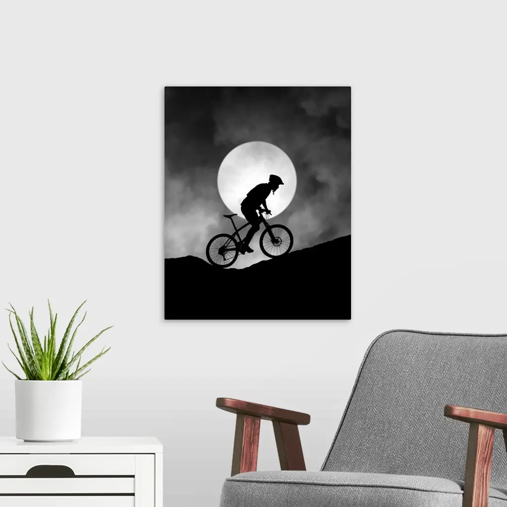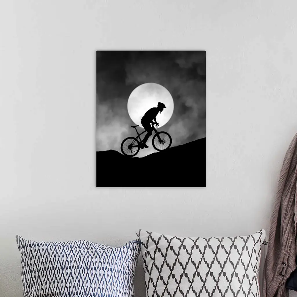 Silhouette of a biker pedaling up a hill, with the moon low in the sky.
