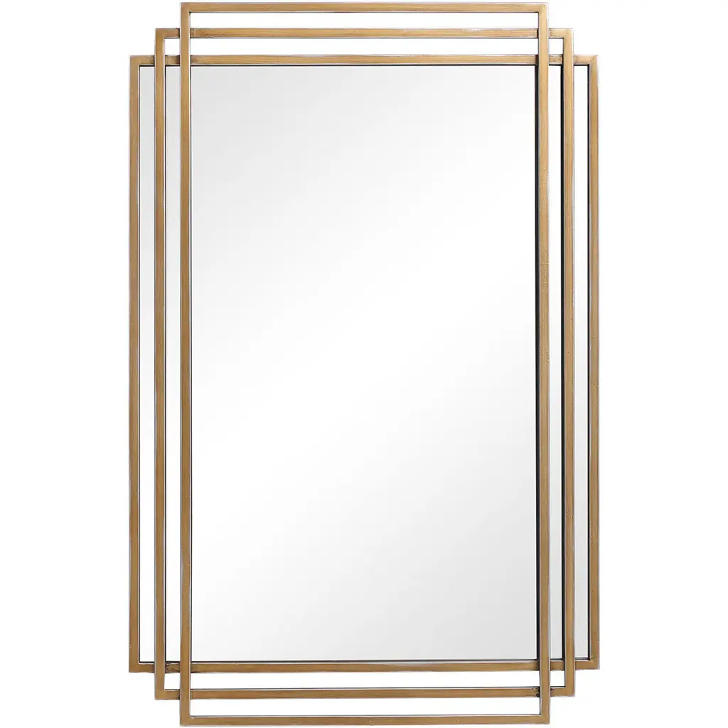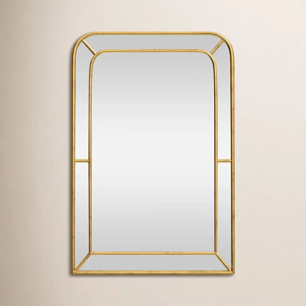 Forged iron featuring 3-dimensional depth, hand finished in a lightly antiqued gold leaf. Mirrors are beveled.