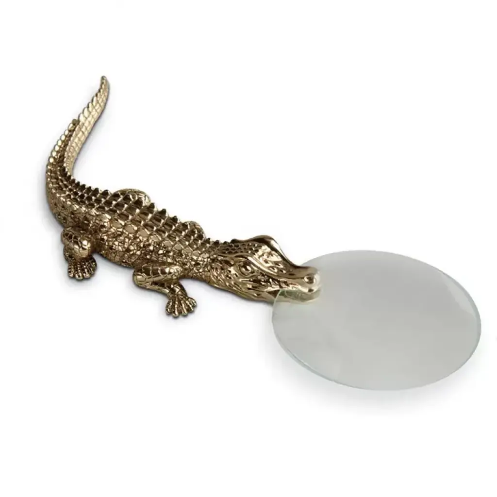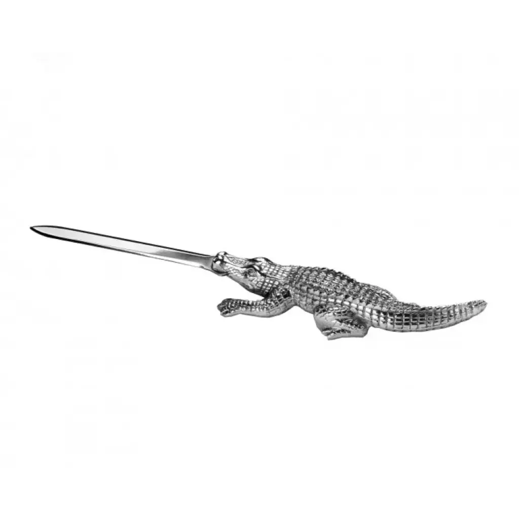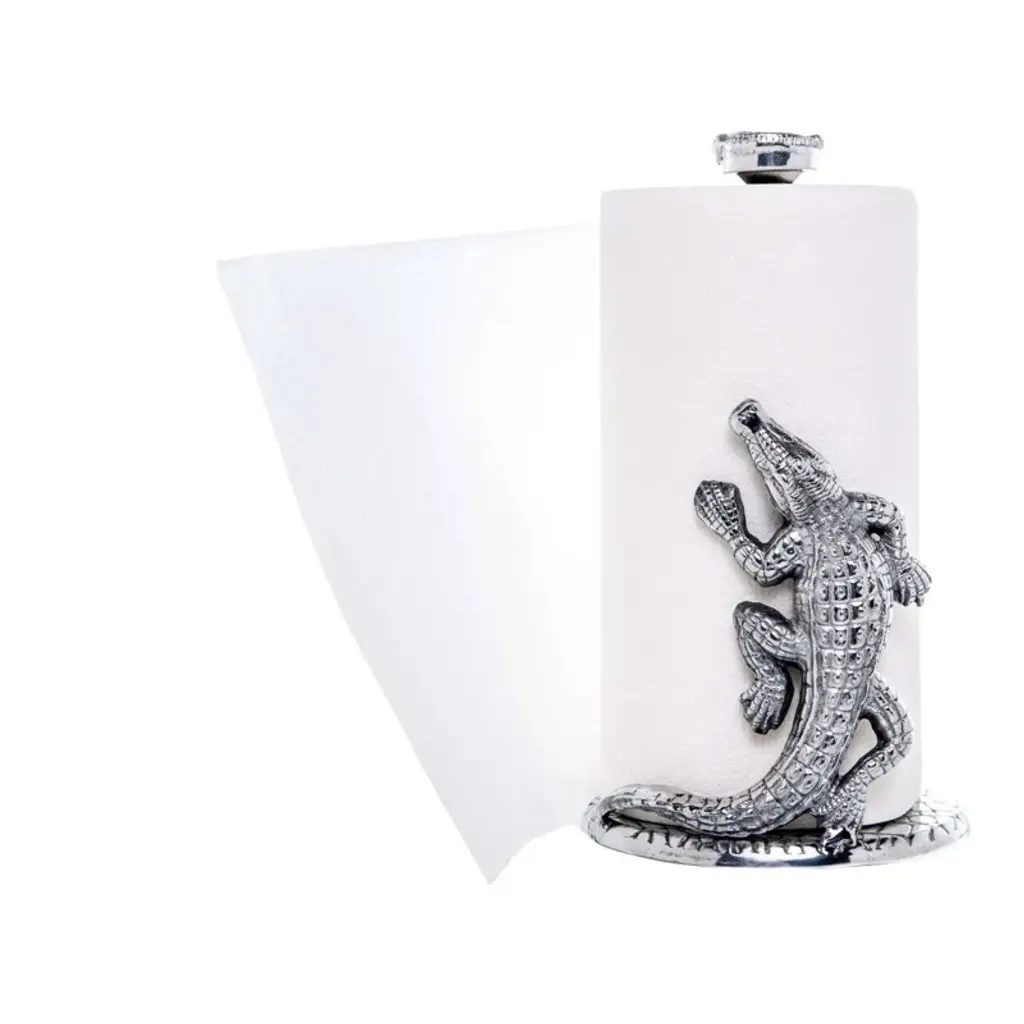 Let this kitchen necessity crawl out of the shadows with Arthur Court's Alligator Paper Towel Holder. This unique design features a crafty alligator working its way up the side of the paper towels, the lifelike detail within its legs and tail creating a realistic, walking posture. Handcrafted in sand-cast aluminum, this beast makes for a surprise for any guest.