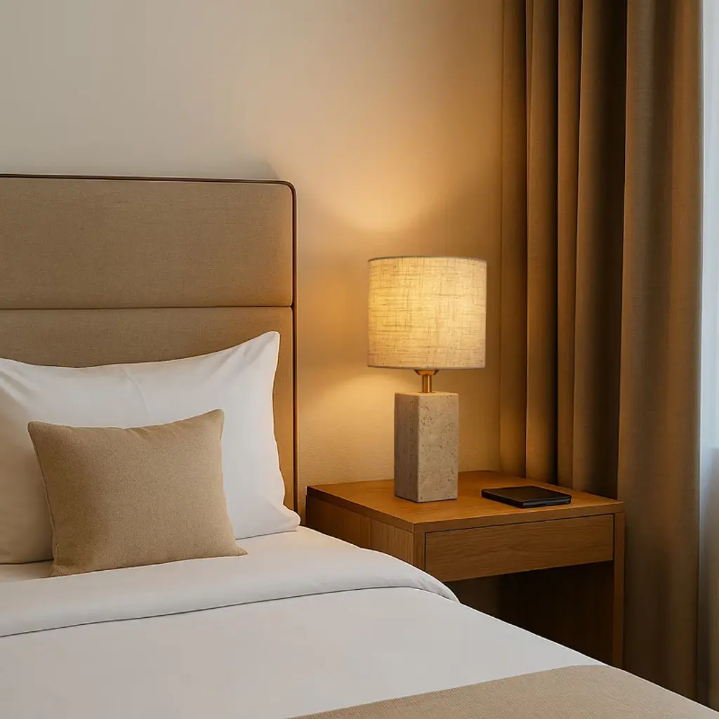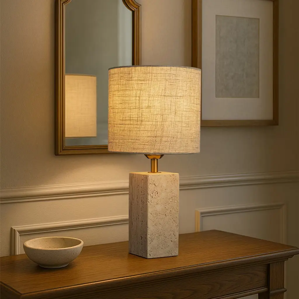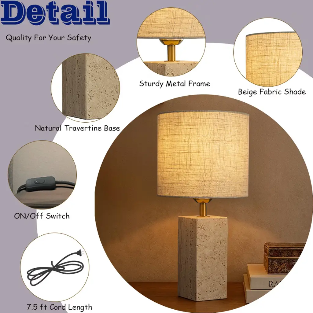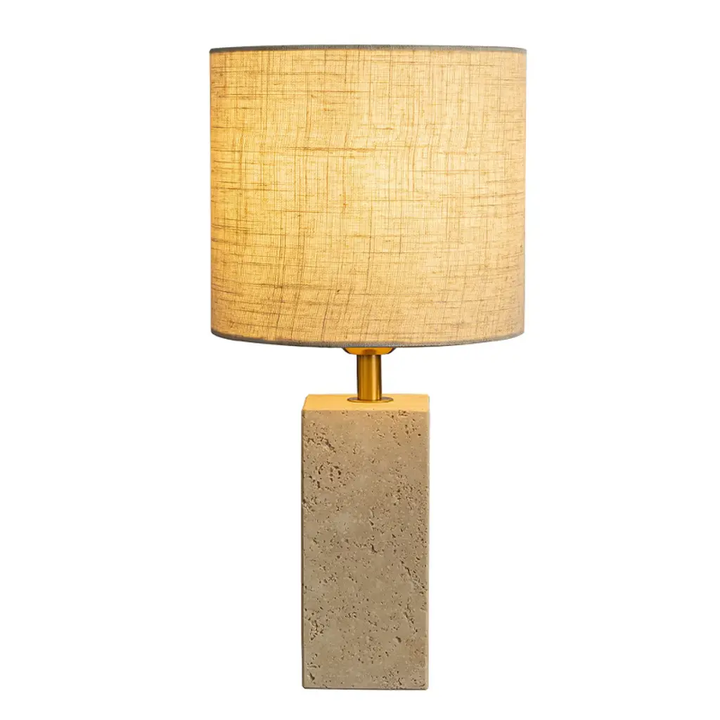 Bring elevated simplicity to your home with the Modern Classic Small Bedside Table Lamp, designed to combine natural beauty with everyday function. Crafted from a natural rectangular travertine stone, the base offers a timeless texture and solid weight, adding quiet luxury to any space. Topped with a beige linen fabric shade, this nightstand lamp provides a warm, ambient glow--perfect for cozy evenings, reading, or relaxed conversations. Sized at W8"" x H16"", this small table lamp is ideal for bedrooms, living rooms, dining rooms, and desks. Whether you're decorating a compact apartment, a modern studio, or a chic Airbnb setup, its clean lines and neutral tones effortlessly complement minimalist, light luxury, and natural styles. The 7-foot cord ensures flexible placement, while the switch makes operation simple and accessible. Setup takes just minutes--attach the shade, insert a standard E26 bulb (Max 60W, not included), plug it in, and enjoy.