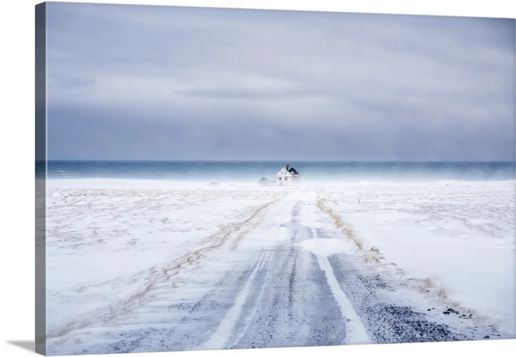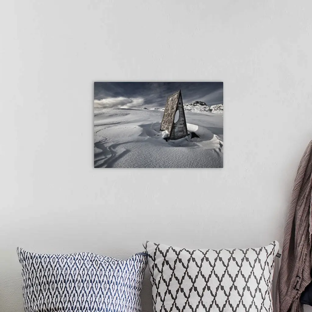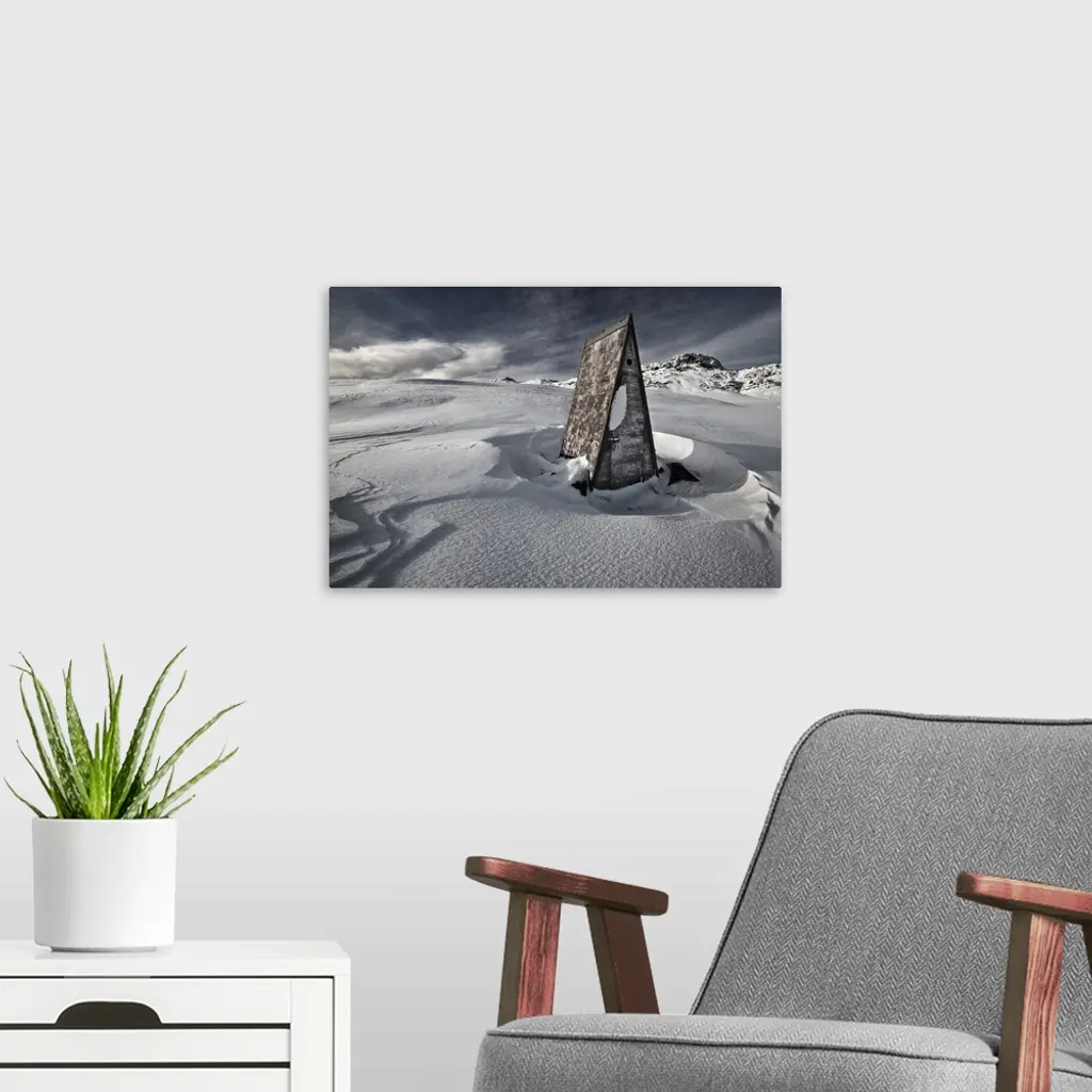 A triangular shack in the deep snow on the Reykjanes Peninsula, Iceland.