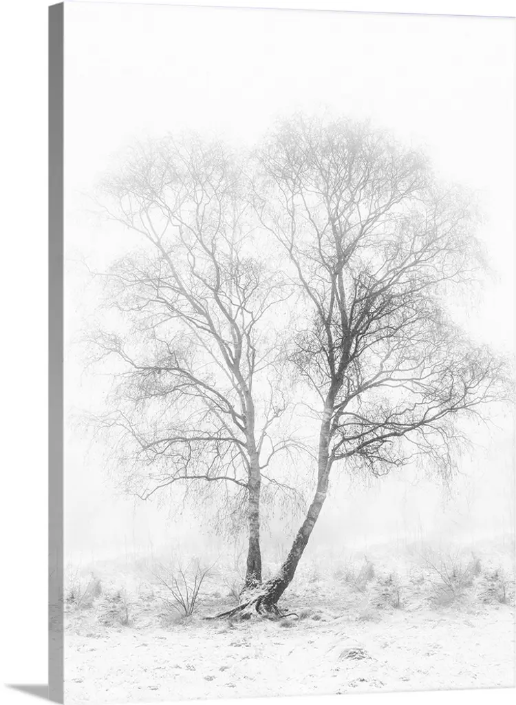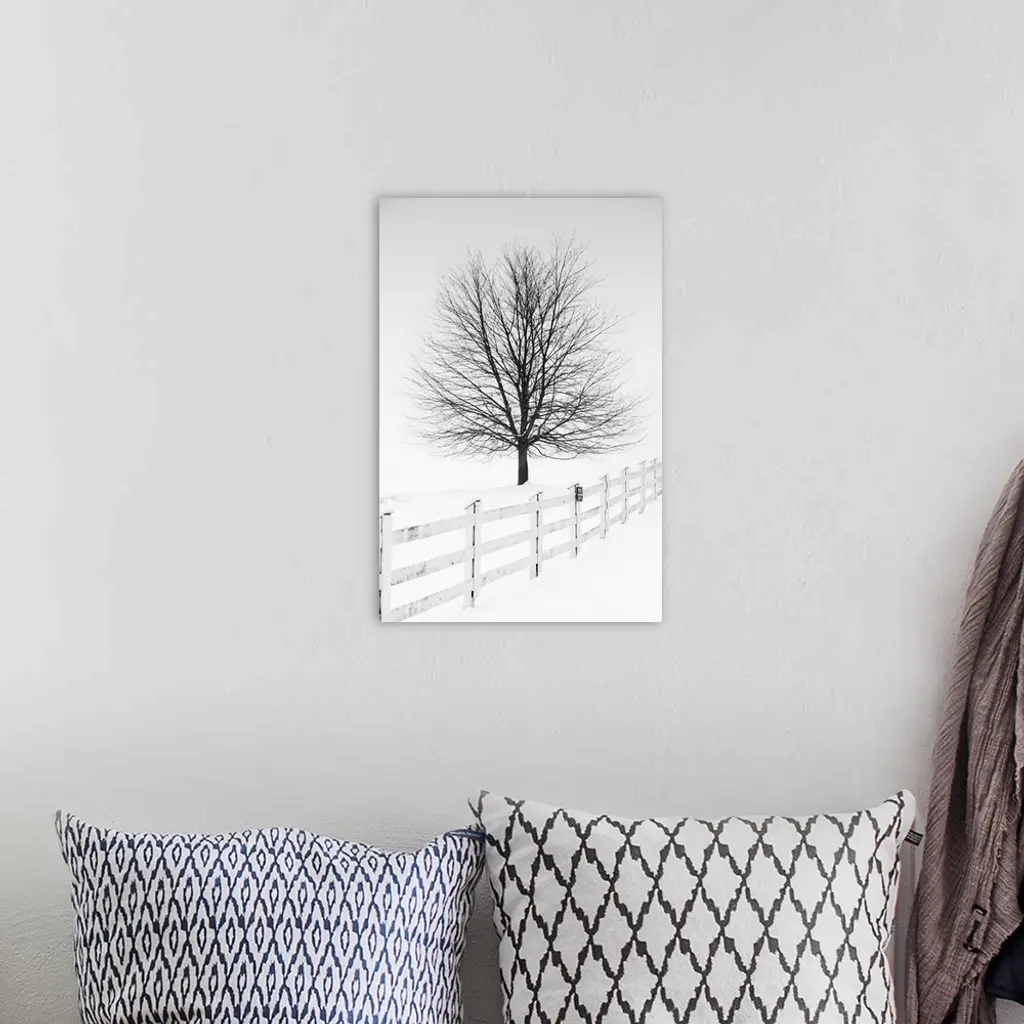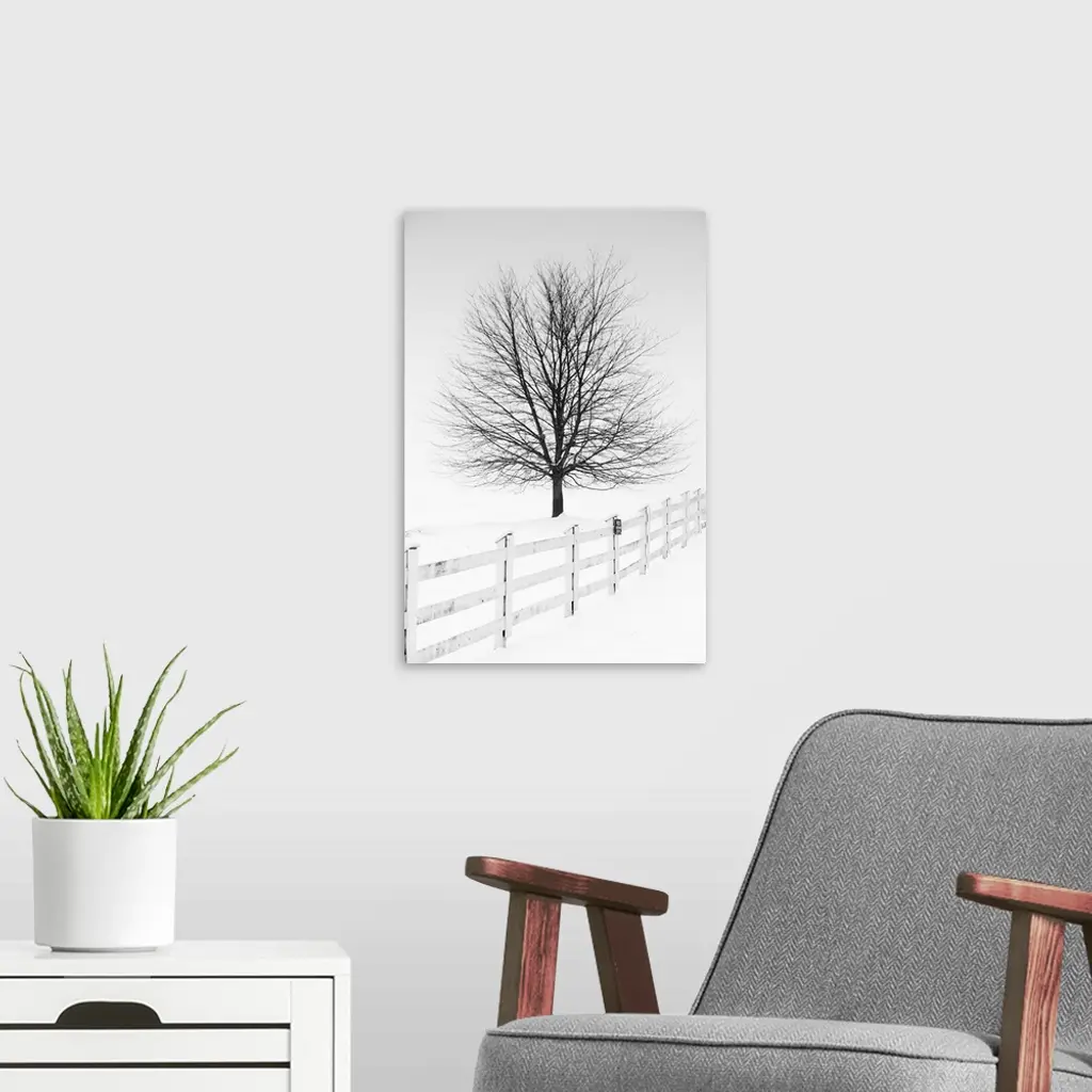 In this photo, a lone tree is contrasting against a white snowy landscape.