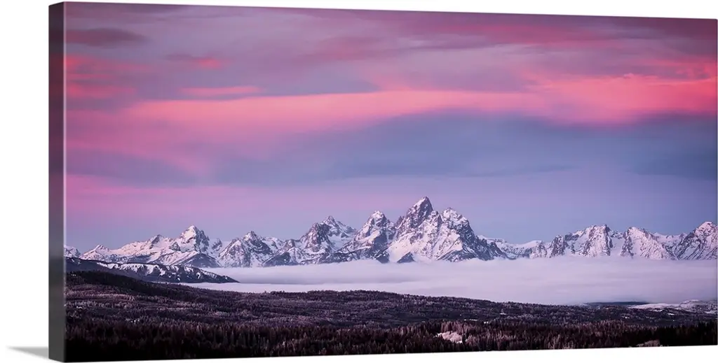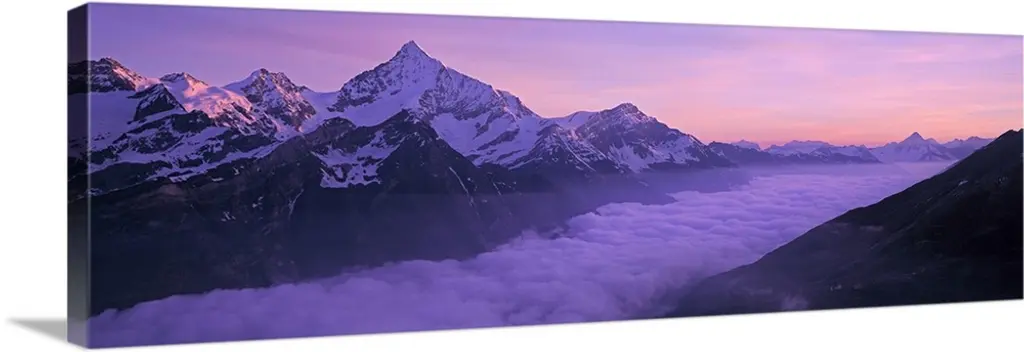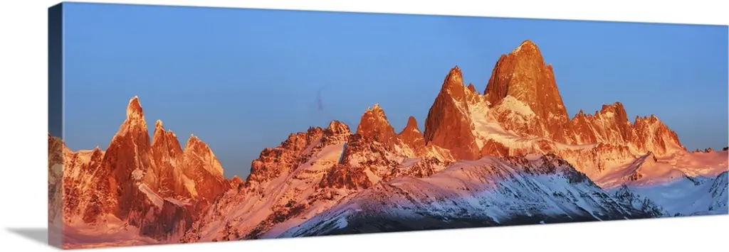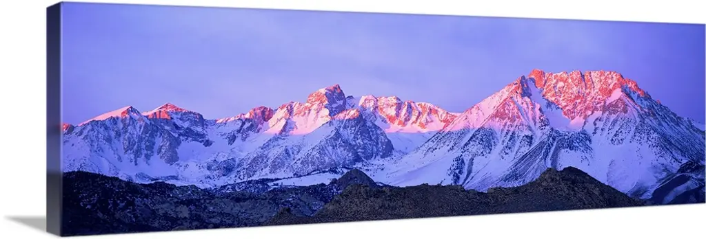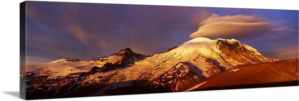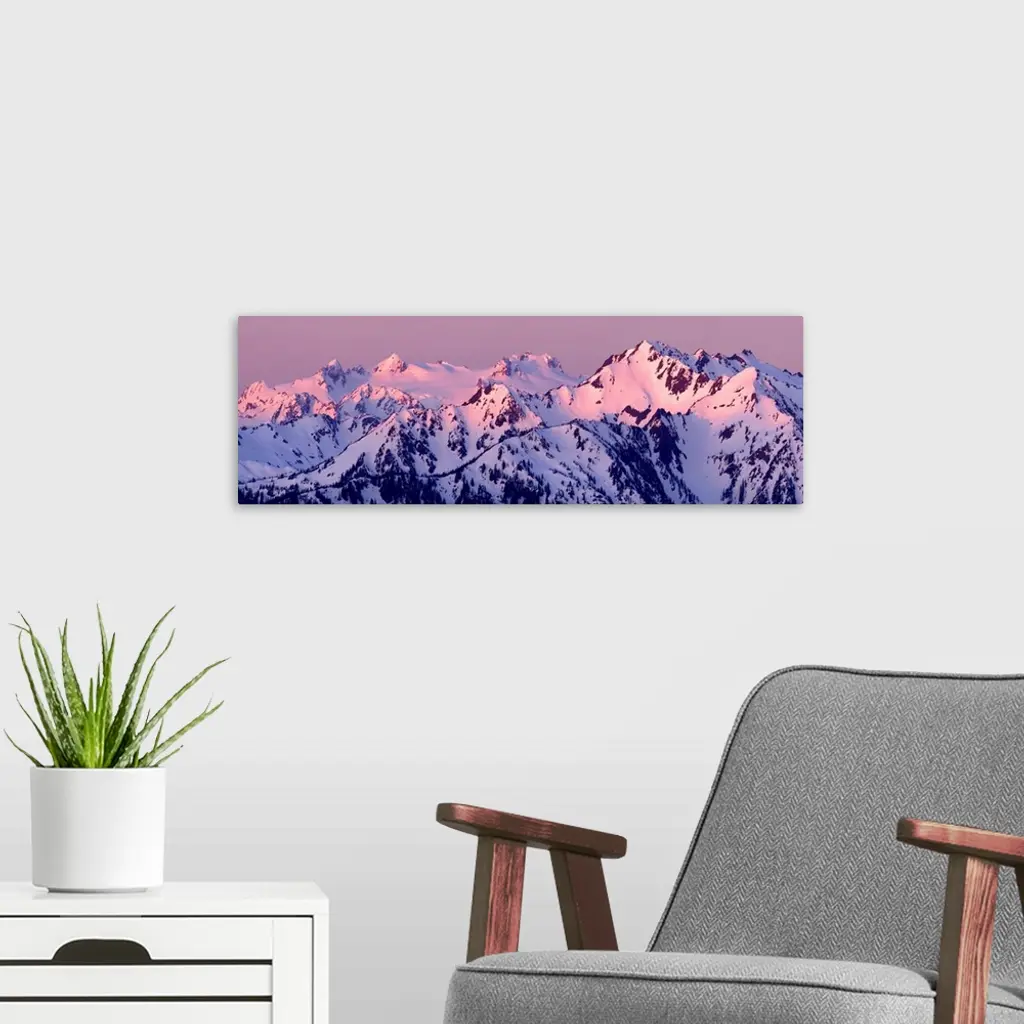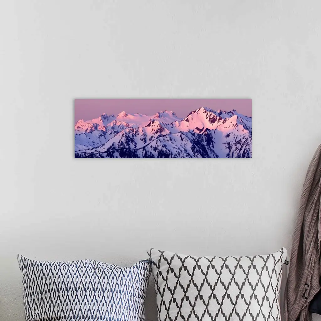 Panoramic photograph of pink alpenglow on top of Mount Olympus, Washington.