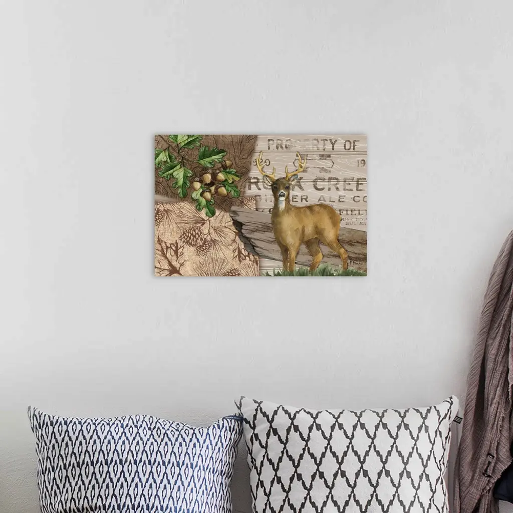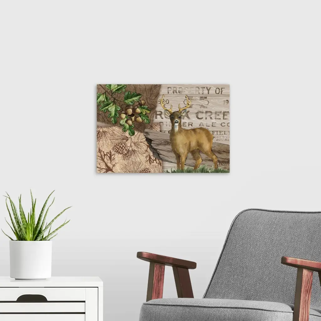 Collage of woodland elements including a deer, acorns, and a property sign.