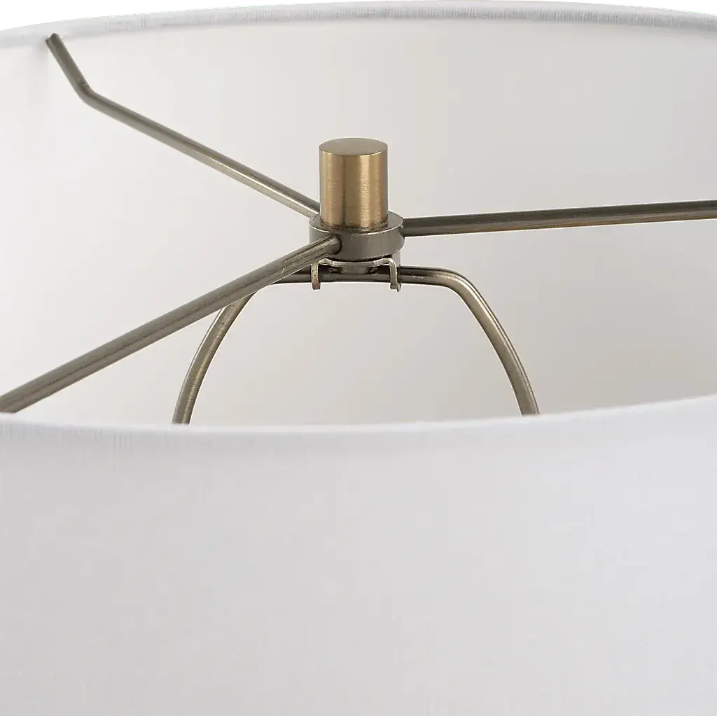 The Alpine Place Clear Lamp offers a unique and stylish lighting option crafted from textured glass. Its ribbed glass base in tones of dark bronze, rust brown and frosted white offers a rustic yet modern appeal and is accented with antiqued brass plated details. The slightly tapered round hardback shade is covered in a white linen fabric. Partial assembly may be required.