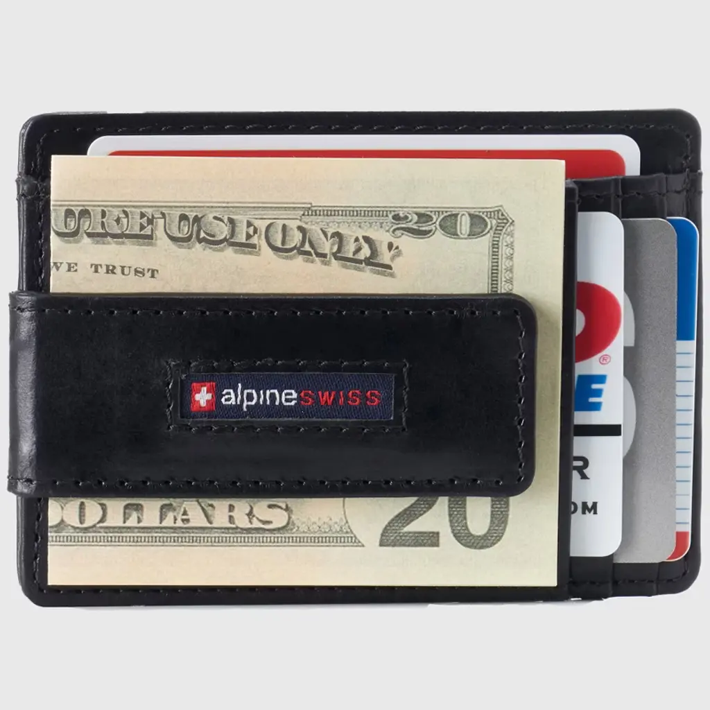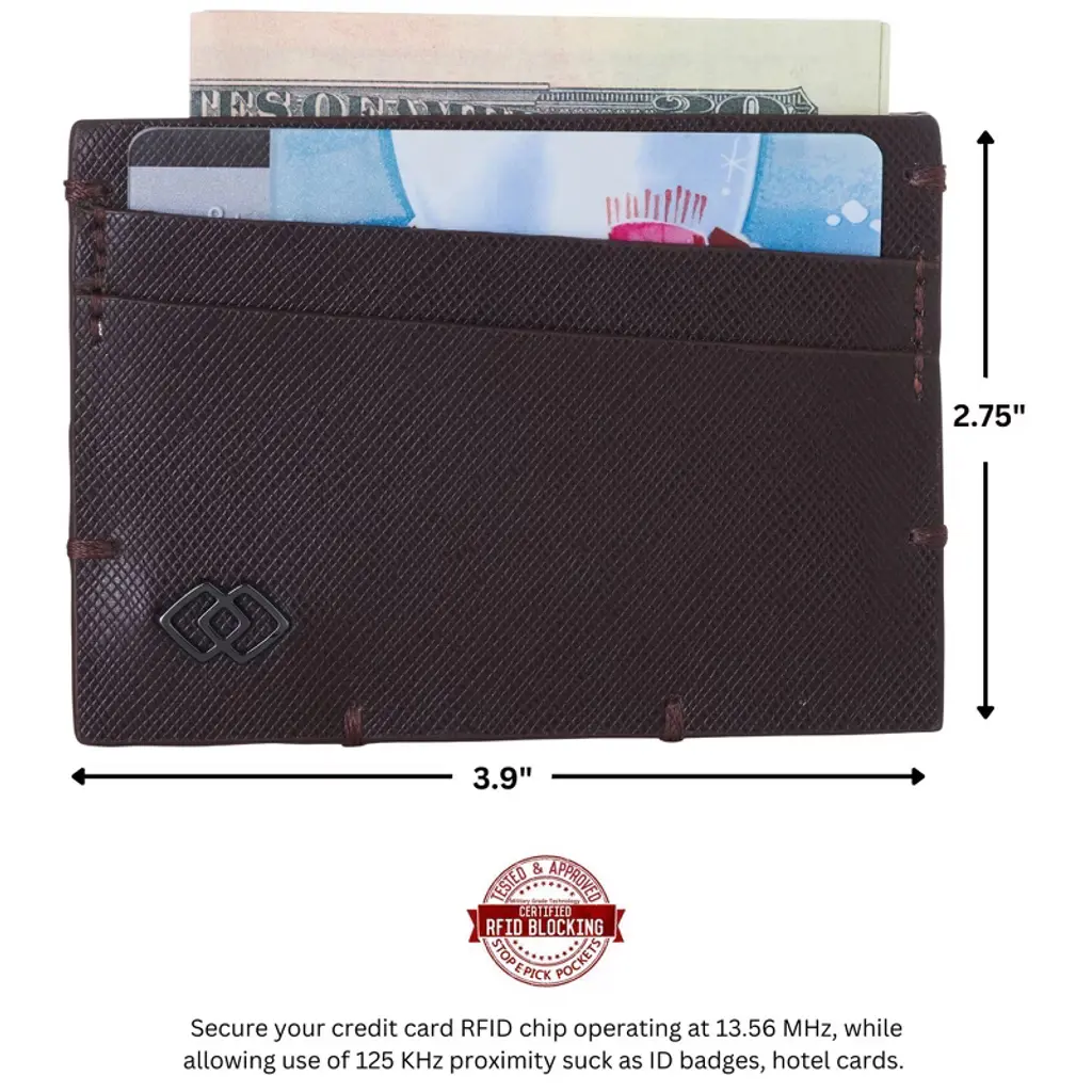RFID Thin Front Pocket Wallet Double Diamond by Alpine Swiss Our new signature Double Diamond Collection features the classic Alpine Swiss style, quality, and functionality you've come to expect, in our most luxurious wallet skins yet. Product Features: Genuine Leather Measures: 3 7/8" L x 2 3/4" H x 1/8" W 4 credit card slots 1 larger main pocket for cards or folded bills Sleek Double Diamond logo in gold or gunmetal hardware Available in a variety of leather skin textures and colors Comes in Double Diamond giftbox for elegant presentation RFID Safe - Certified Independent Lab Tests in Met Labs Santa Clara, CA facility. Secure your personal data for credit card RFID Chips operating at 13.56 MHz Frequency while allowing use of 125 KHz Proximity Cards such as ID badges, hotel cards & some transit cards.