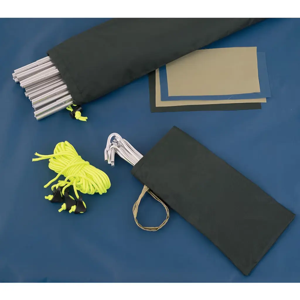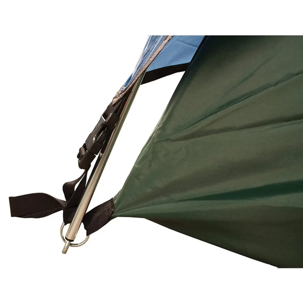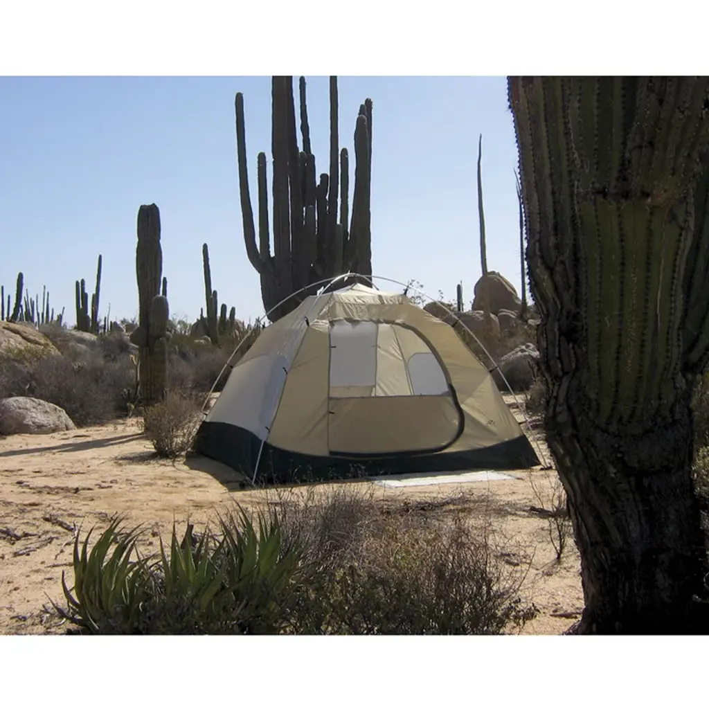 The Meramac Outfitter takes all of the standard features of the Meramac and enhances them with 3 key upgrades: oversized #10 door zippers, a heavy-duty nylon oxford floor, and 7000 Series aluminum poles. The #10 door zippers will give you a lifetime of smooth operation and the oxford floor, which is about twice the weight of normal nylon floor material, will greatly increase the durability of your tent. The following features are the same as the Meramac. Assembly is really easy with the tent clips that just snap in place over the poles. The polyester fly and oxford floor are urethane coated, with factory-sealed seams for maximum weatherproof. The two doors make getting in and out of the tent much easier, especially in the middle of the night when you need to take a quick "break". The fly buckles to the tent, offering a much more secure attachment when compared to the elastic cord. Mesh roof vents increase ventilation and improve star gazing. Features: Color: Blue/Tan Free-standing two-pole design with 7000 series aluminum poles 75D 185T Polyester fly resists UV damage and stays taut Factory-sealed fly & floor seams give best weather protection 210D 110T Nylon Oxford floor with 1500mm coating #10 zippers on doors Easy entry with two doors and "single zipper operation" Great ventilation with two zippered windows in the doors Weatherproof fly with a ridge pole provides an awning over each door Mesh storage pockets and gear loft included Includes 8" aluminum stakes, carry bag, and guy ropes Specifications: Base Size: 7'6 x 8'6 Center Height: 60" Vestibule Depth: N/A Tent Area: 64 ft? Vestibule Area: N/A Total Weight: 10 lbs. 2 oz. Minimum Weight: 9 lbs. 6 oz. Packed Size: 7" x 24" Pole Diameter: 11 mm