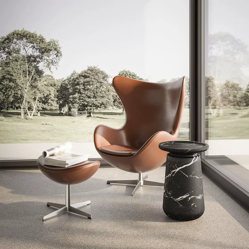 Distinguished by a warm shade of terracotta only interrupted by gray details and luminous white veining, the stone gives an entirely unique quality to the design, whose harmonious silhouette is a combination of impeccably balanced proportions and smooth volumes. Please note that marbles and stones are natural materials and they can differ also if coming from the same quarry or the same block. The base has a diameter of 32 cm.