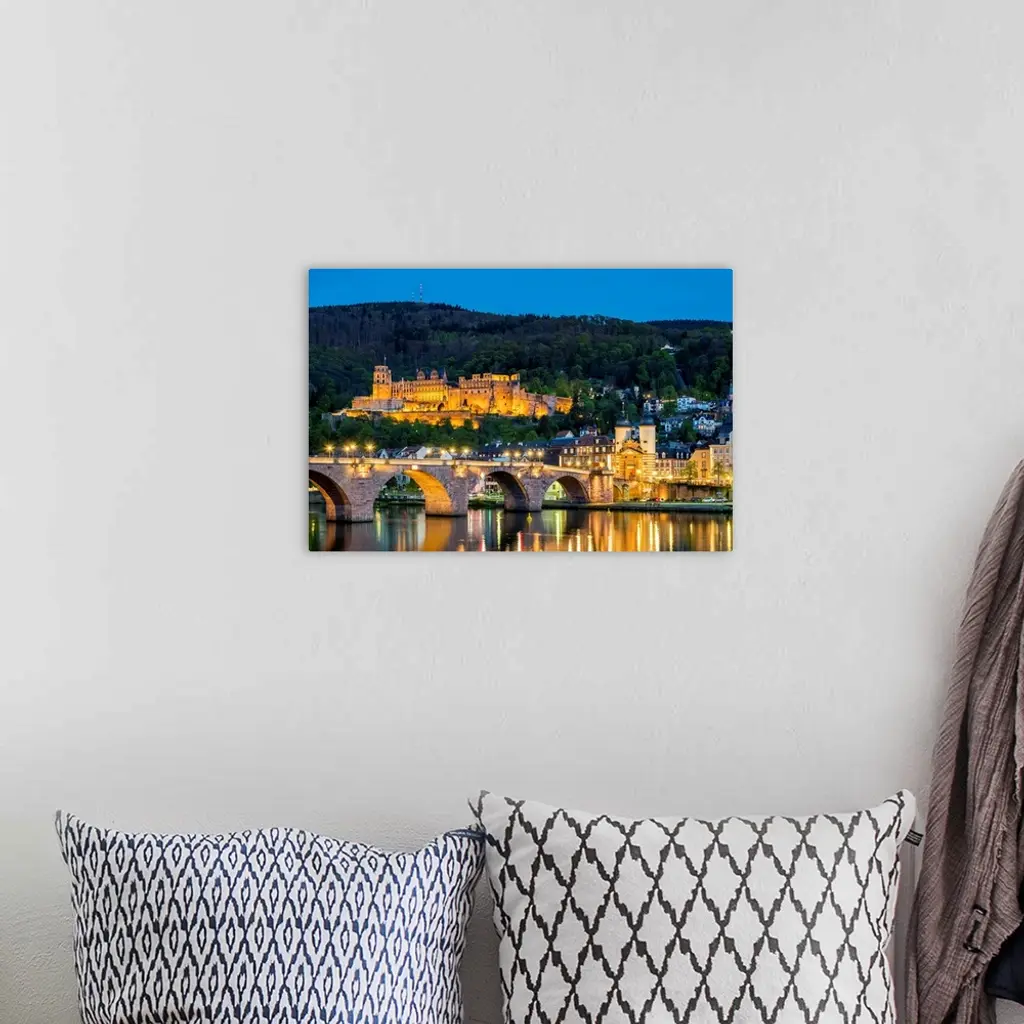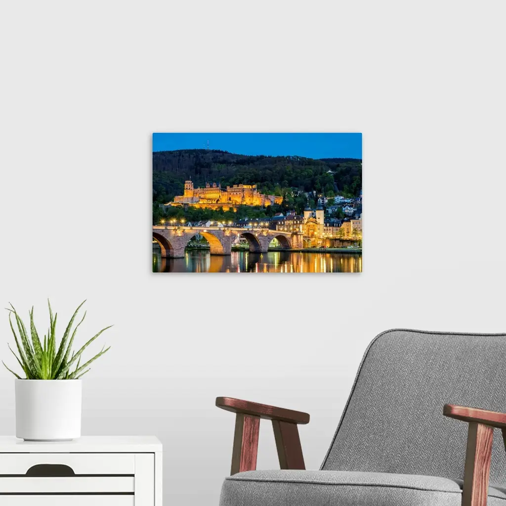 Germany, Baden-Wurttemberg, Heidelberg. Alte Brucke (old bridge) and Schloss Heidelberg castle on the Neckar River at night.
