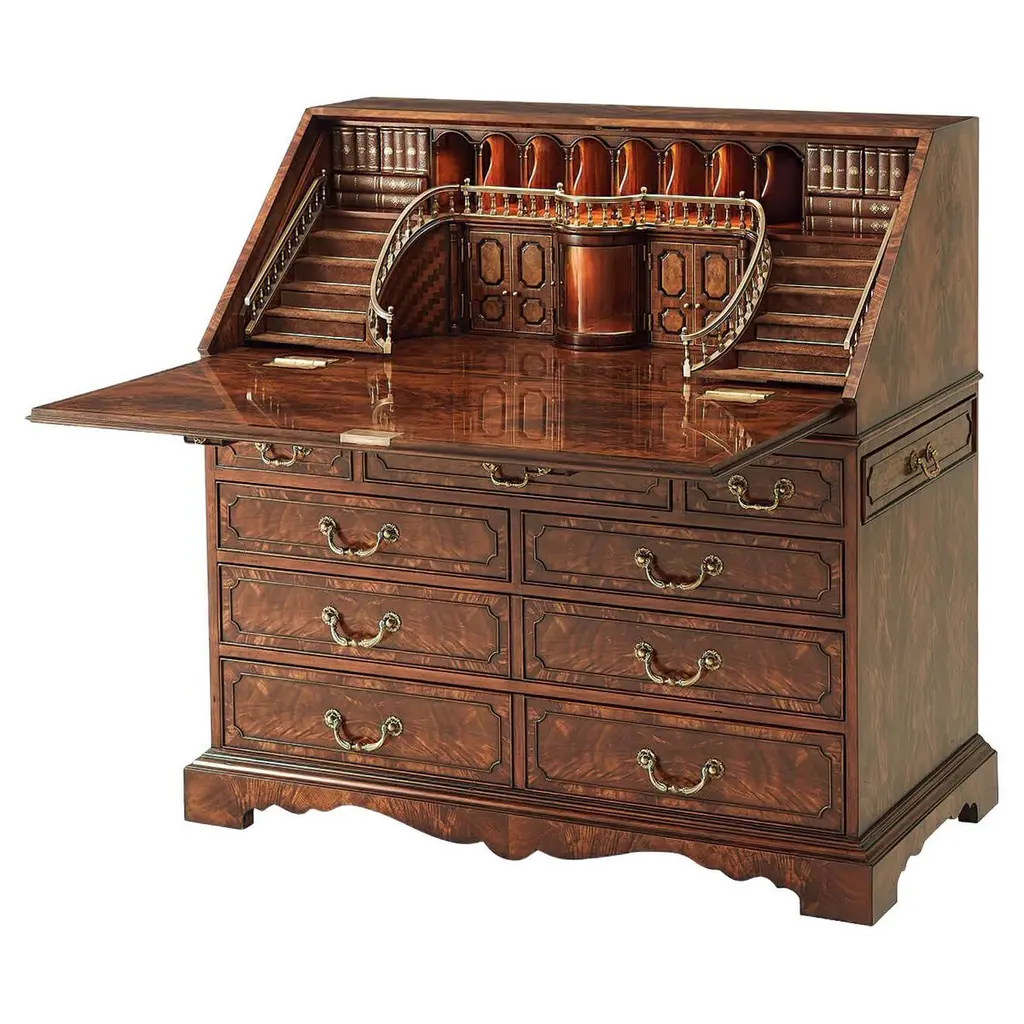 A fine flame veneered bureau, the sloping fall enclosing a fitted interior of faux book and hidden drawers and cabinets, the staircase gallery interior, above a short frieze drawer flanked by dummy drawers, with two short and two long drawers below, on bracket feet; the sides with further drawers and hidden drawers.