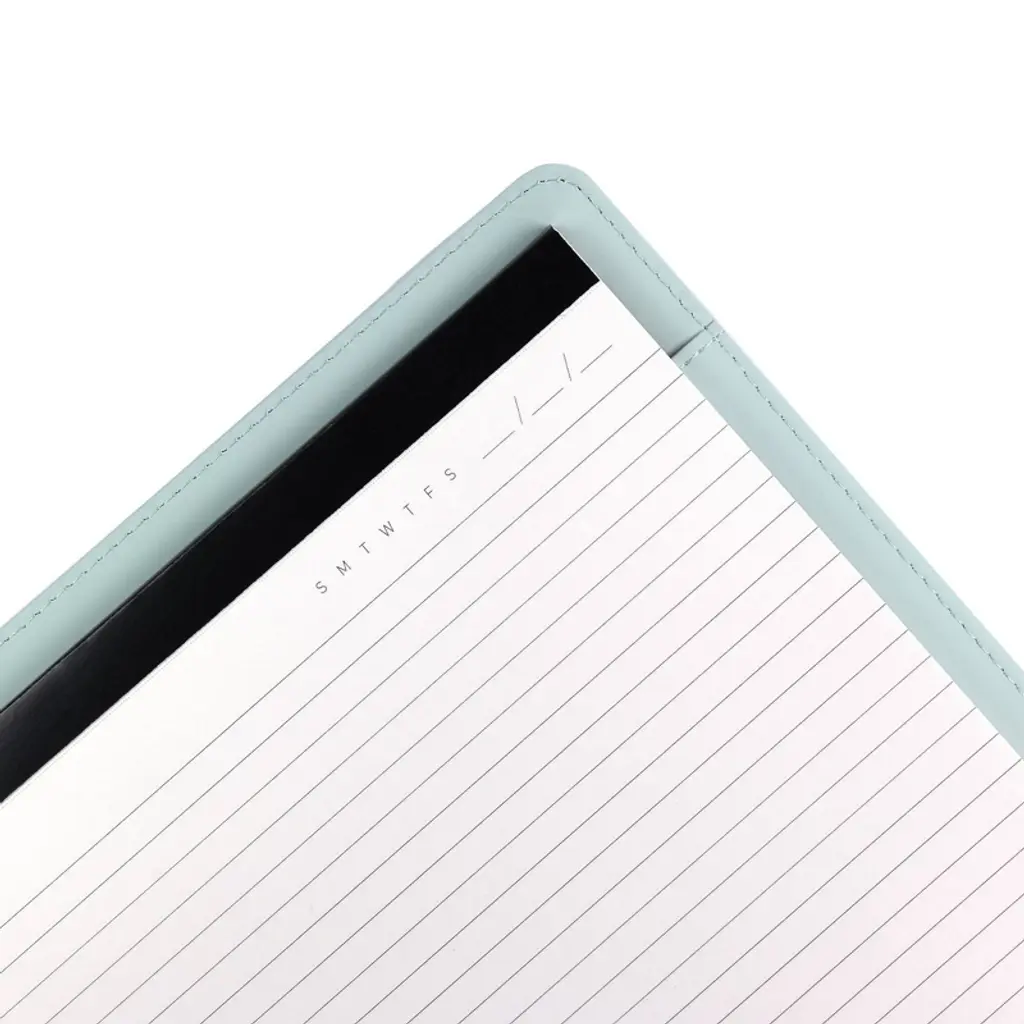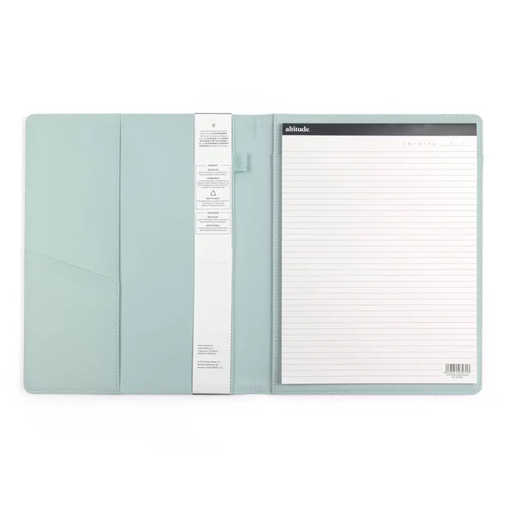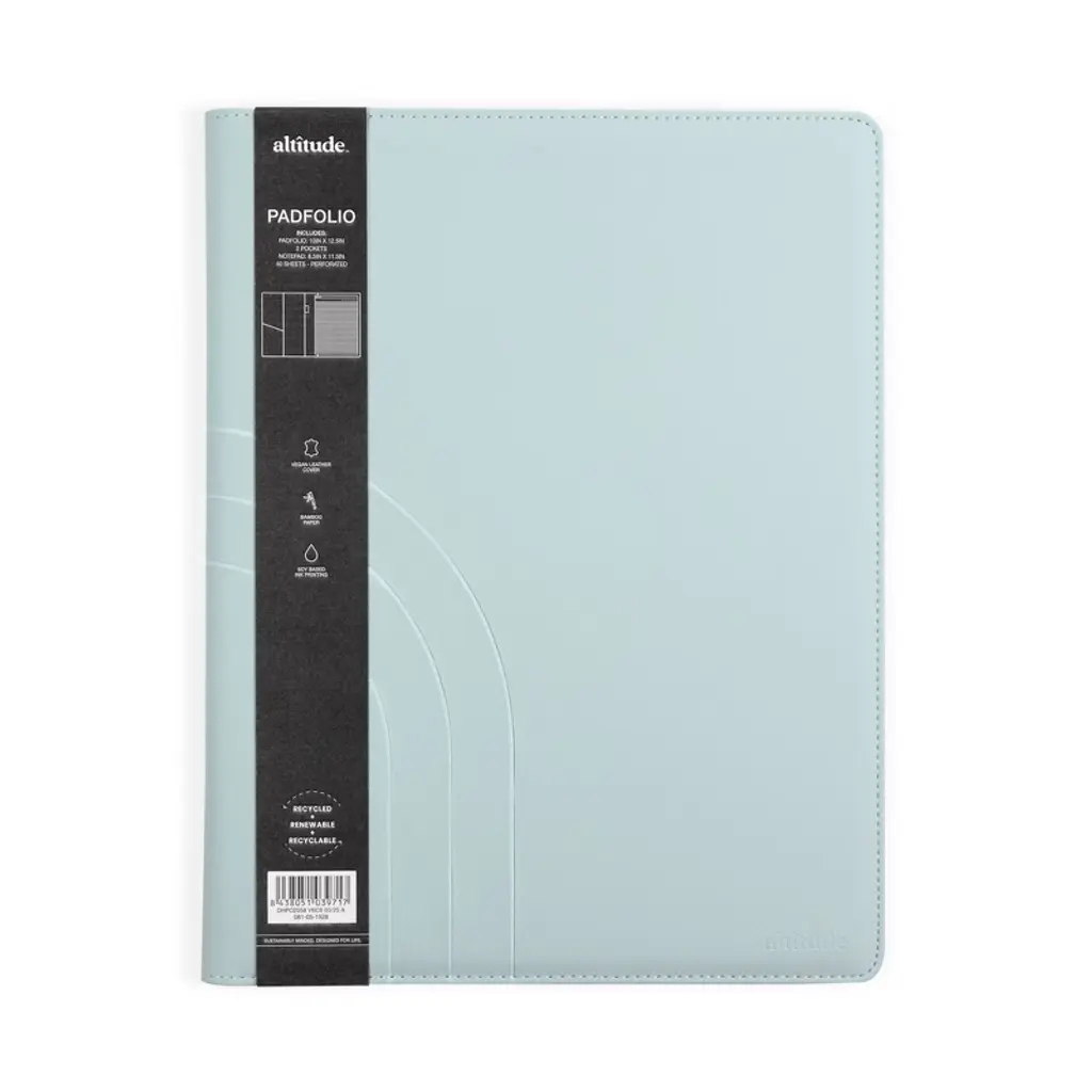 This product is made from bamboo paper which is a renewable material, so you can stop your search for a sustainable padfolio. Our seafoam blue padfolio with a soft, vegan leather cover includes 1 pen loop, 2 interior pockets and 1 paper pad with 40 sheets to keep you organized for the year.ProductRecycled: 35% of the cover is made of recycled materials.Renewable: The interior pages and paper pocket folder are made from bamboo paper. Bamboo is one of the most sustainable plants on earth, growing 2-3 feet every day.Recyclable*: For more details on how to recycle components of this product, please visit www.altitudesupplies.comPackagingRecycled: More than 95% of this packaging is made from recycled material.Recyclable*: Please remove clear sticker from paper band before recycling.Sustainably minded, designed for life. What we purchase has a huge impact on the environment. That's why we design products that are durable and lessen the impact on the planet*. We use sustainably sourced materials wherever possible.*For more details about our products and how to recycle please visit www.altitudesupplies.com.