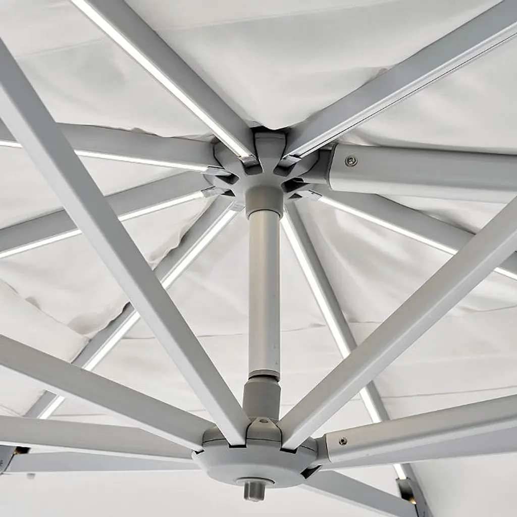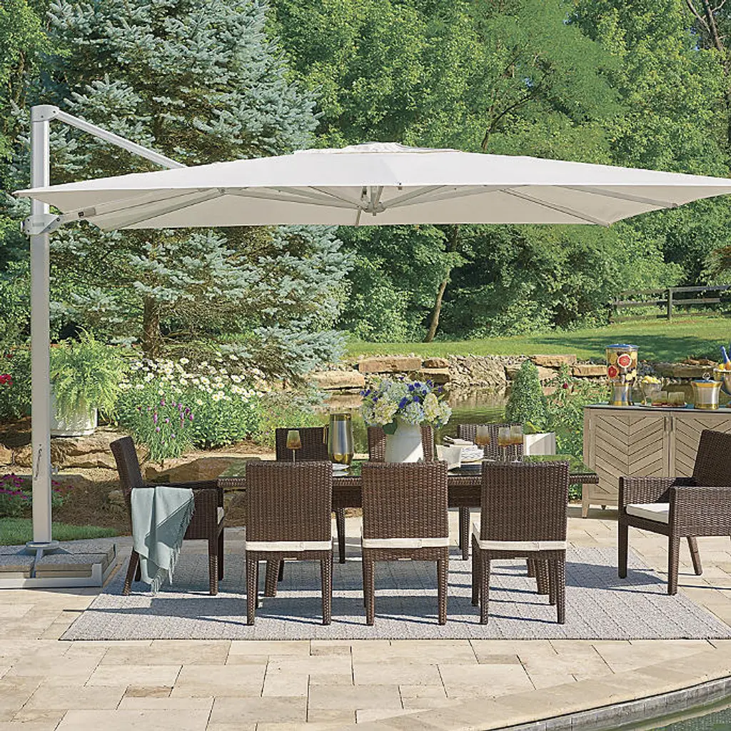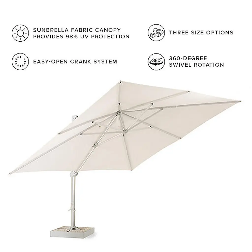 Expansive shade and optimal sun protection housed in a compelling architectural design that features LED rib lighting. Colorfast canopy made of 100% Sunbrella® solution-dyed acrylic fabric. The easy-open crank and 360° swivel rotation make it ideal for optimal coverage throughout the day. Contract-grade Oversized aluminum framed umbrella All fabrics are 100% Sunbrella® solution-dyed acrylic canopy fabric that resists the damaging effects of sun, mildew and dirt Lightweight yet sturdy powdercoated aluminum pole Requires twelve 16" x 16" pavers (not included) to stabilize Aluminum frame with a Silver finish LED rib lighting is powered by a USB-compatible rechargeable battery pack (included) Easy-open crank system 360-degree swivel rotation Always close umbrella when not in use and in inclement weather Base included Includes a custom cover and pole to assist with covering Replacement parts available upon request Assembly Required Imported At Frontgate, our primary focus is quality. We guarantee that every product we sell will stand up to the supreme test – our customers' satisfaction. To learn more about our policies, visit our Shipping & Processing, Returns & Exchanges and Warranty & Price Guarantee pages.