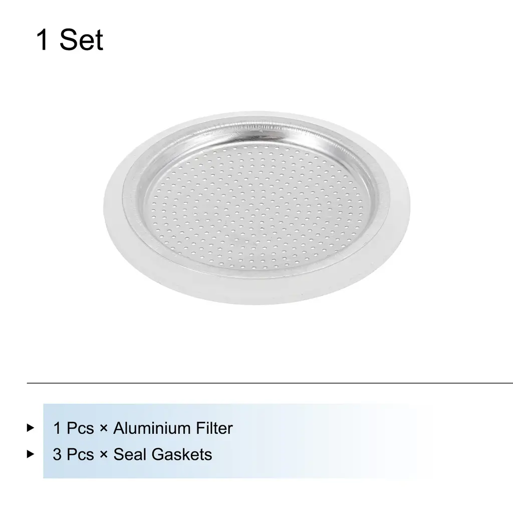 What is this?The espresso maker replacement filter is a critical accessory for the aluminum coffee pot, after a long time of daily use, the coffee pot old filter is important to replace a new one to extend the useful life of the potWhat will I get?The mocha pot filters,size: 56x48x4mm/2.2x1.89x0.16 inch(OD*ID*H);Type: Fit for 3-Cup use mocha coffee pot, Material:Aluminium;Color: Silver,Package Content(4PCS):1 × Aluminium Filter,3 x Seal Gaskets,Are there any advantages of the product?The coffee pot filter is made of aluminum with a smooth surface, strong and study, durable and rust-resistant for Long-term use.How to use it?Replace the old filter of your coffee machine with the filter you receive, easy to install and remove.What should I notice? Notes:The product is manual measurement, there is a little error, please refer to the actual product.