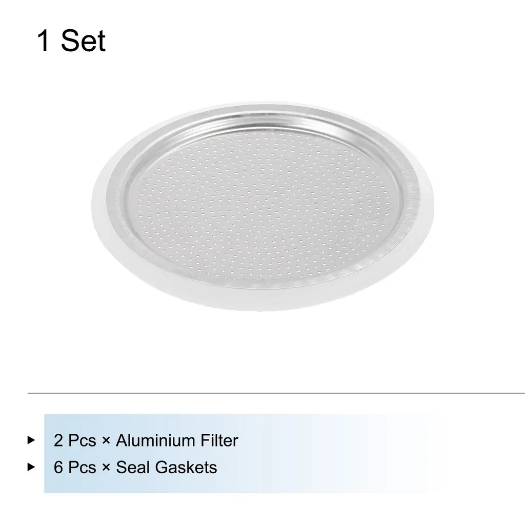 What is this?The espresso maker replacement filter is a critical accessory for the aluminum coffee pot, after a long time of daily use, the coffee pot old filter is important to replace a new one to extend the useful life of the potWhat will I get?The mocha pot filters,size: 82x71x5.5mm/3.23x2.8x0.22 inch(OD*ID*H);Type: Fit for 12-Cup use mocha coffee pot, Material:Aluminium;Color: Silver,Package Content(7PCS):1 × Aluminium Filter,6 x Seal Gaskets,Are there any advantages of the product?The coffee pot filter is made of aluminum with a smooth surface, strong and study, durable and rust-resistant for Long-term use.How to use it?Replace the old filter of your coffee machine with the filter you receive, easy to install and remove.What should I notice? Notes:The product is manual measurement, there is a little error, please refer to the actual product.