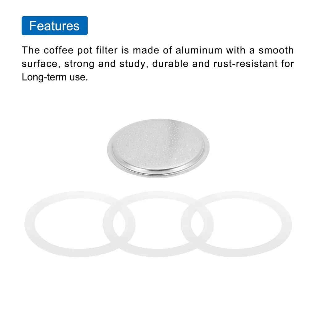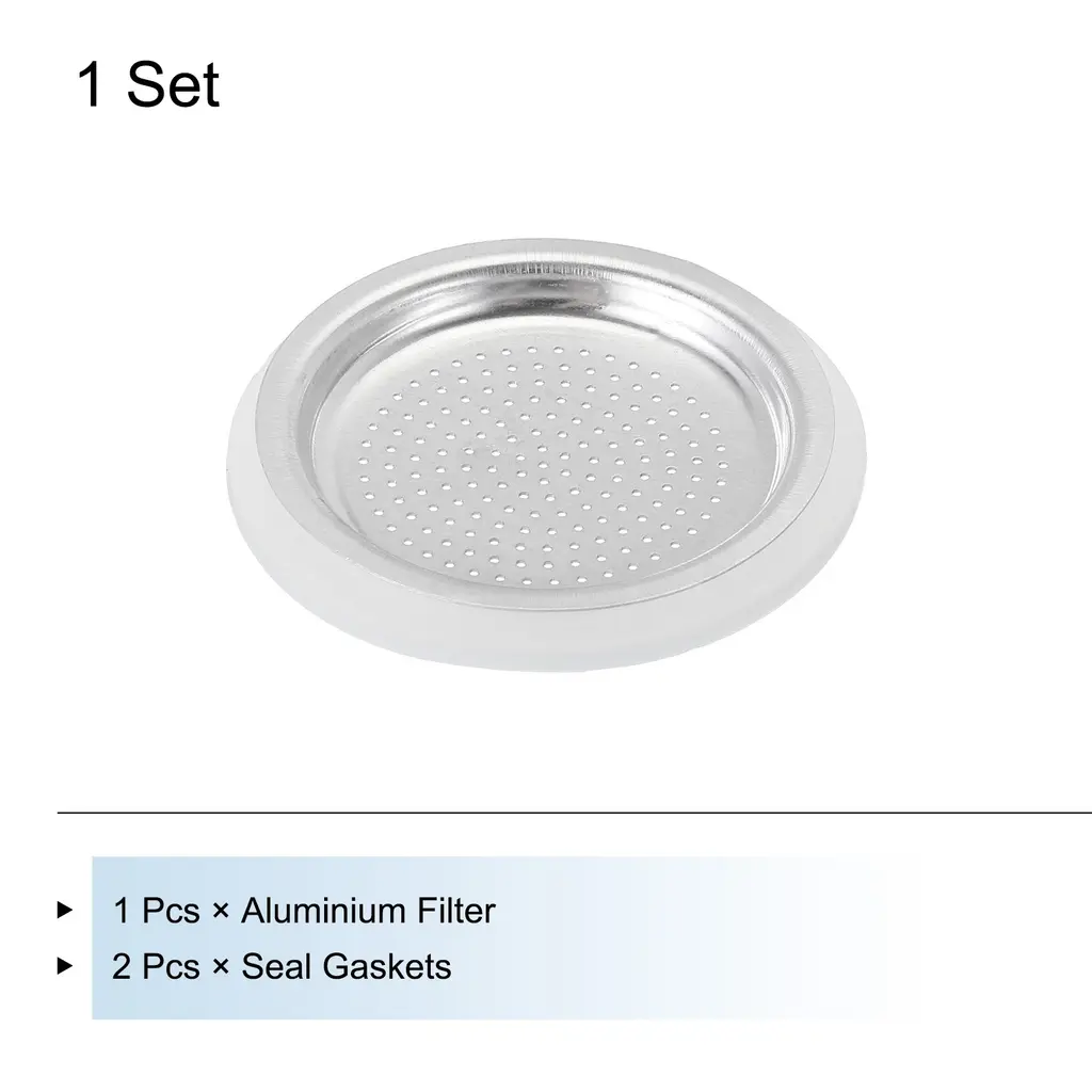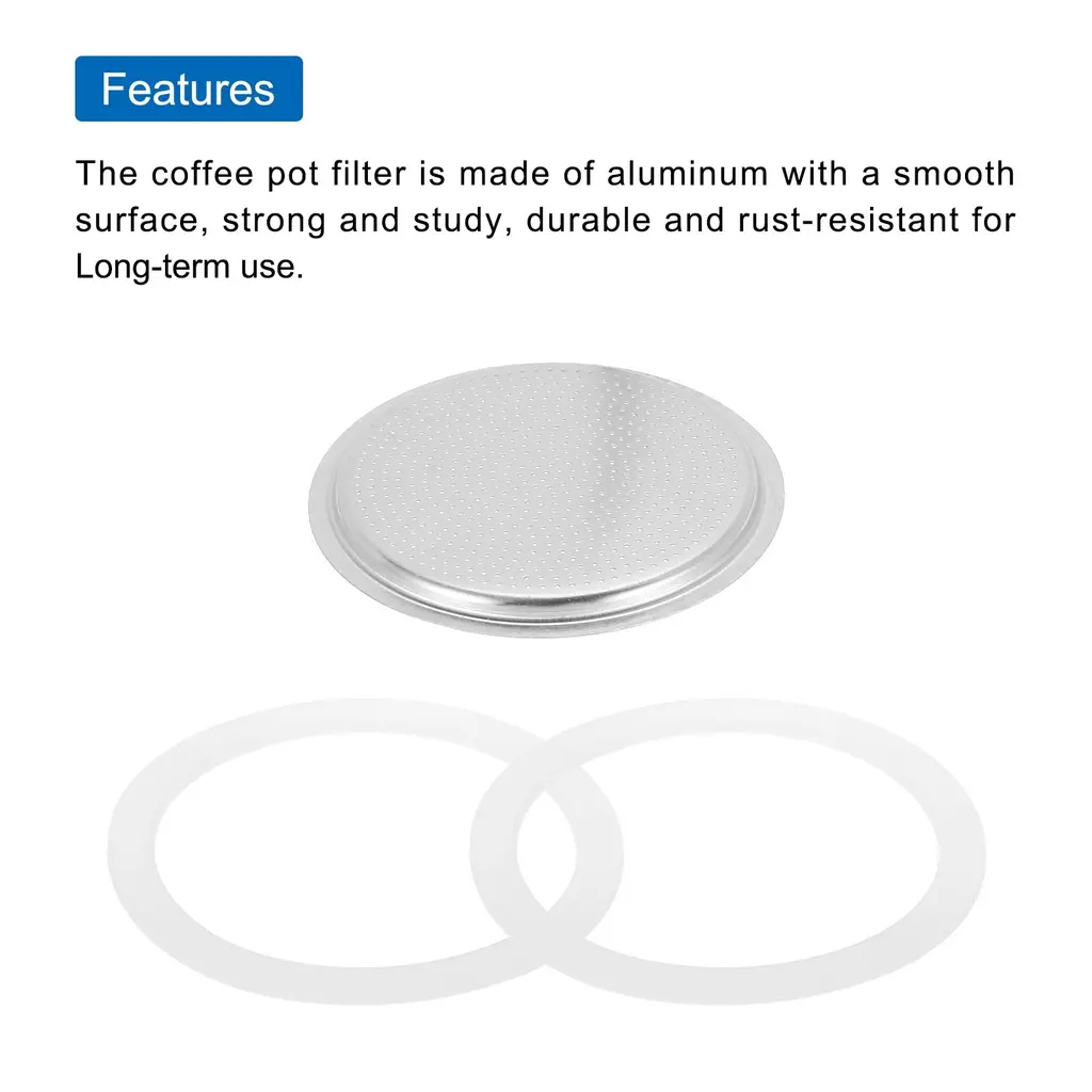 What is this?The espresso maker replacement filter is a critical accessory for the aluminum coffee pot, after a long time of daily use, the coffee pot old filter is important to replace a new one to extend the useful life of the potWhat will I get?The mocha pot filters,size: 50x41x5mm/1.97x1.61x0.2 inch(OD*ID*H);Type: Fit for 2-Cup use mocha coffee pot, Material:Aluminium;Color: Silver,Package Content(3PCS):1 × Aluminium Filter,2 x Seal Gaskets,Are there any advantages of the product?The coffee pot filter is made of aluminum with a smooth surface, strong and study, durable and rust-resistant for Long-term use.How to use it?Replace the old filter of your coffee machine with the filter you receive, easy to install and remove.What should I notice? Notes:The product is manual measurement, there is a little error, please refer to the actual product.